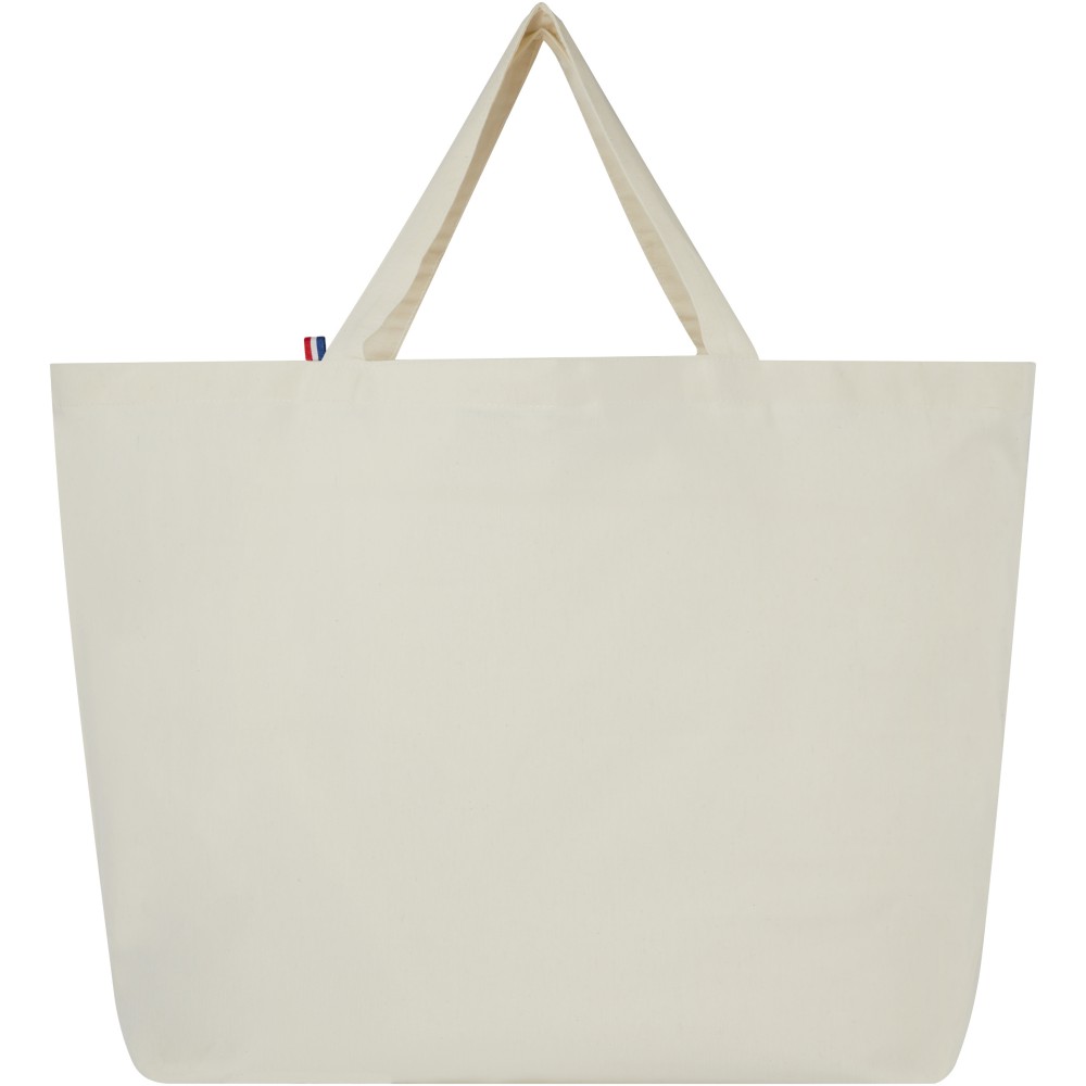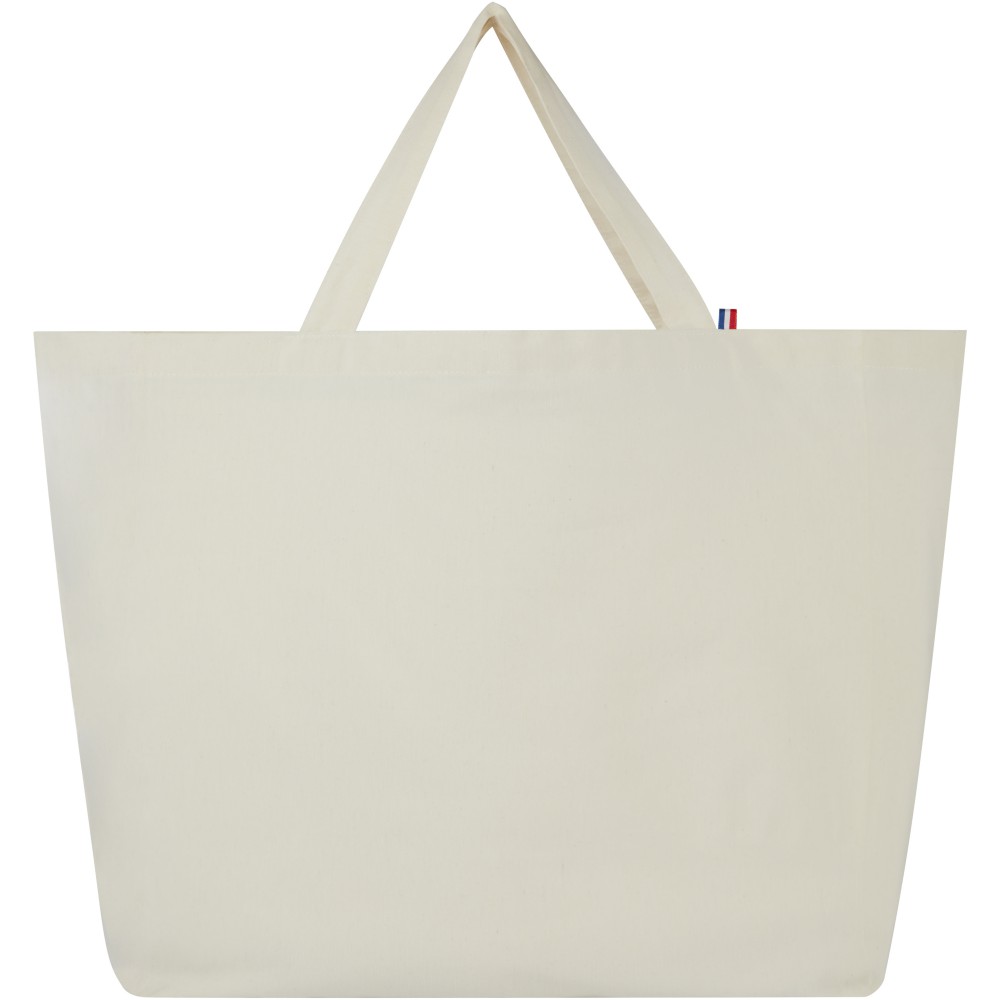 Ez a nagy táska a legfinomabb kidolgozású, 100%-ban újrahasznosított anyagokból készült. A mindennapi életben való használatban alkalmas nehéz könyvek vagy bevásárlások szállítására. A 200 g/m2-es újrahasznosított pamut/poliészter keverék biztosítja a tartósságot és a megbízhatóságot, így a táska akár 14 kg súlyt is elbír. Az alapanyag Ázsiából származik, de a szövés és a gyártás Franciaországban történik. Emblémázás: Szitanyomás