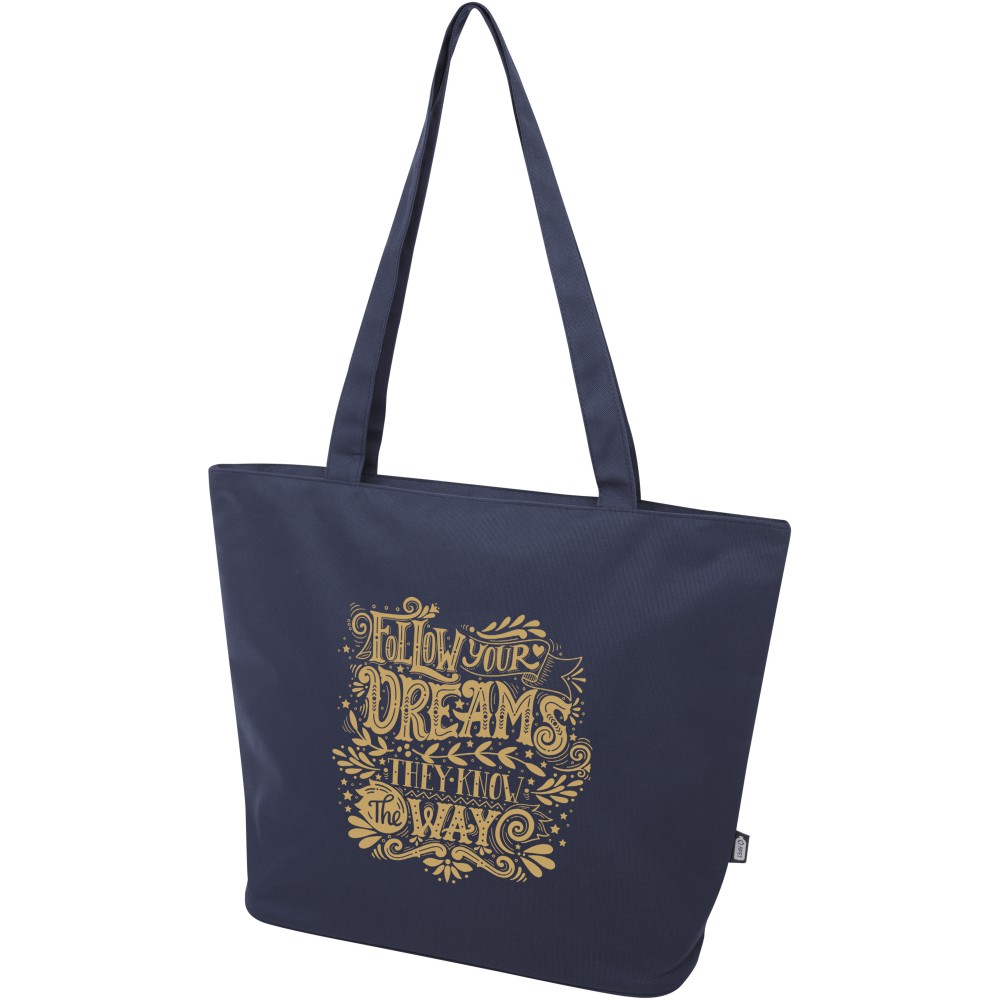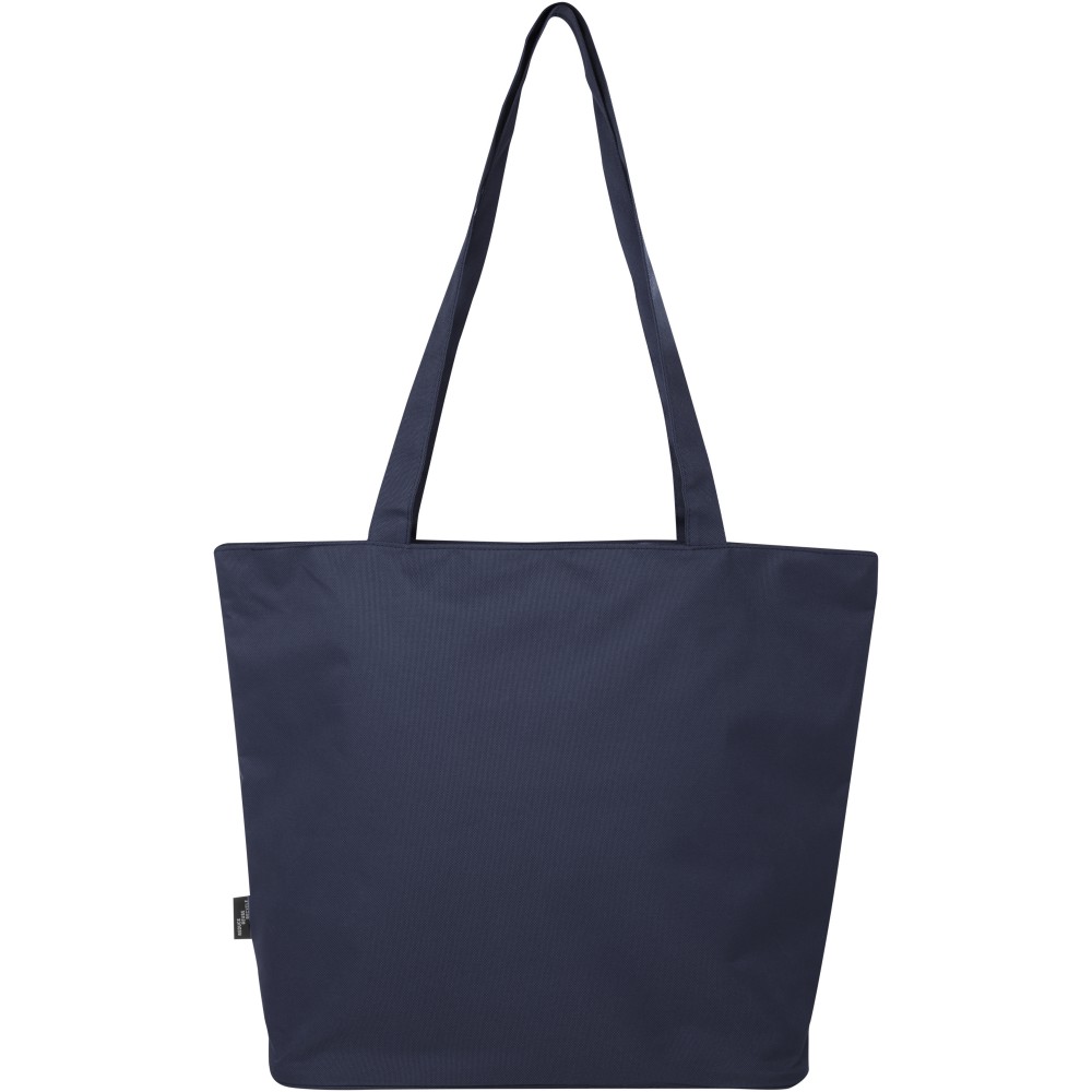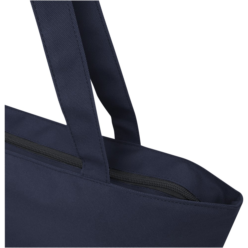A vízlepergető 600D rPET anyagból készült Panama GRS újrahasznosított cipzáras táska tökéletes és fenntartható választás, ha rendezvényre, strandra vagy bevásárlásra készülsz. Egy cipzáras főrekesszel és egy cipzáras belső zsebbel rendelkezik, amely elég nagy a telefonod vagy más értékes holmi tárolására. Fülei 34 cm hosszúak, ezért a táska könnyen hordozható vállon. Teherbírás: 10 kg. PVC-mentes. Emblémázás: Szitanyomás