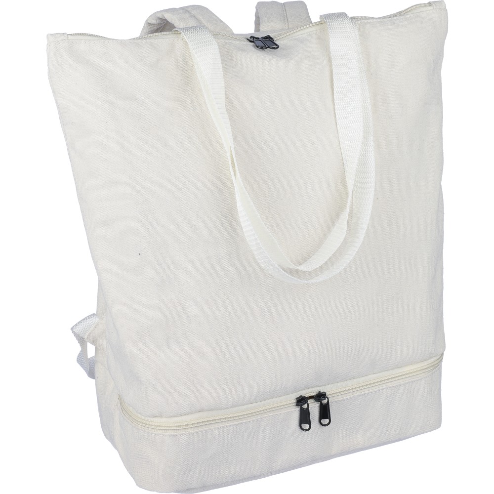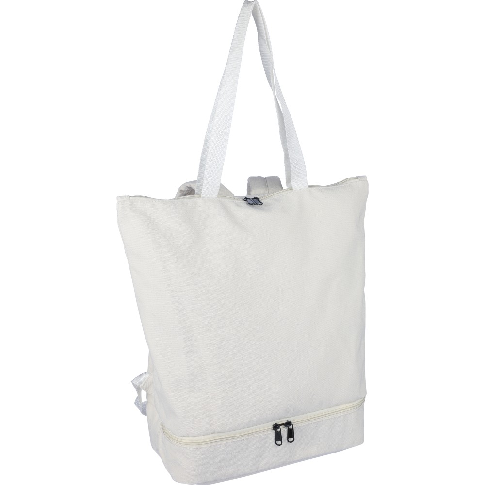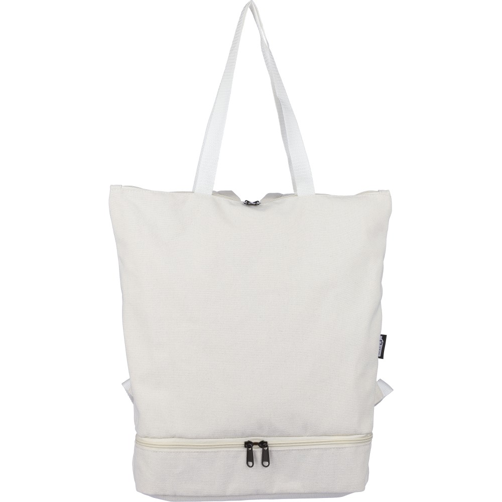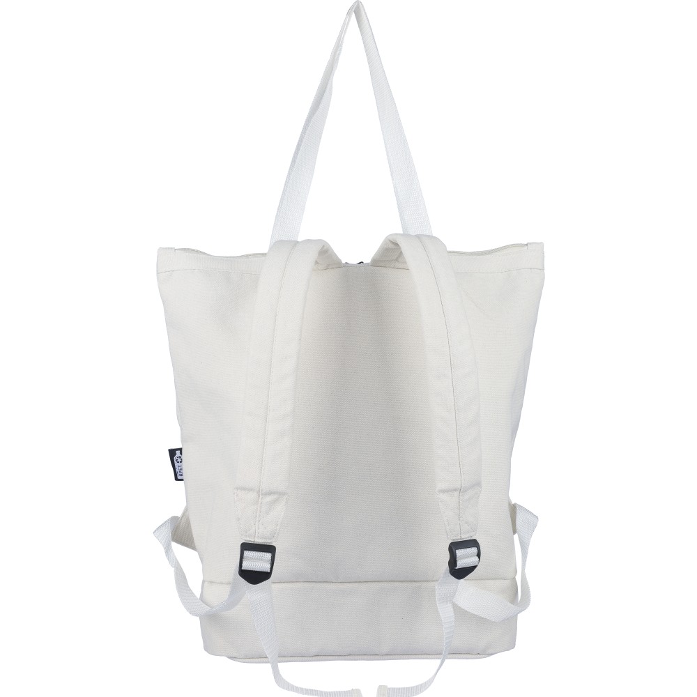 Bevásárlótáska és hátizsák 330 g/m2 újahasznosított policotton anyagból, 210D poliészter béléssel. Egy nagy cipzáras rekesszel a tetején, cipzáras rekesszel az alján, 15"-es laptoptartó résszel, két belső rekesszel és egy külső cipzáras résszel. Hordozófüllel és párnázott, állítható vállpánttal. Űrtartalom: 30 liter, teherbíró képesség: 15 kg. Címkét tartalmaz.