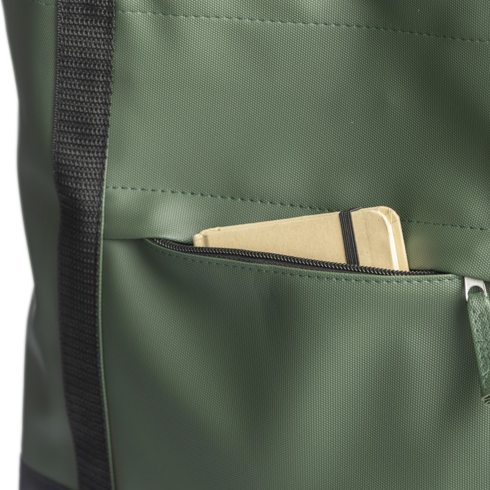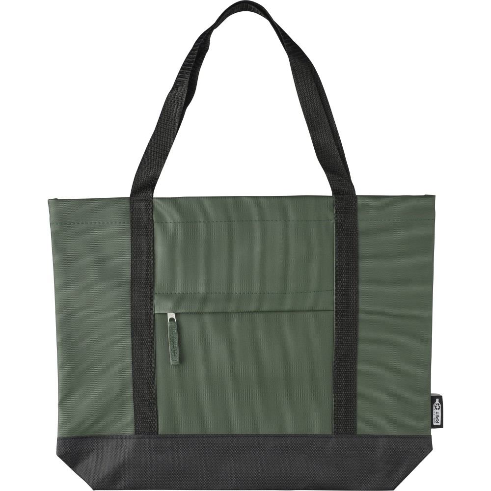 600D rPET poliészter bevásárlótáska. Mindkét oldalon PU bevonat teszi vízlepergetővé. Első cipzáras zsebbel, kicsi, belső cipzáras zsebbel és hosszú hordozófüllel. Kapacitása 10 liter. Oldalán rPET címkével. Emblémázás: Szitanyomás