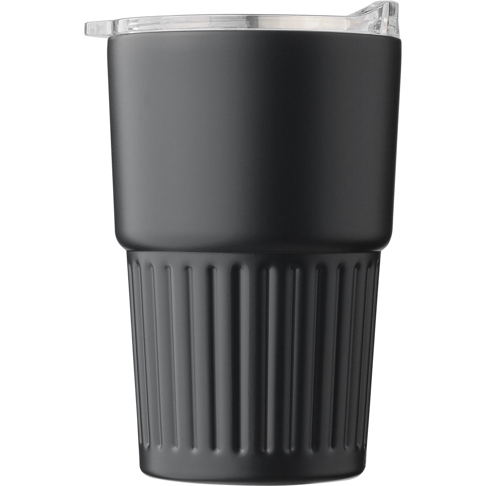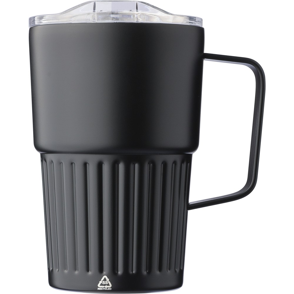 Újrahasznosított rozsdamentes acél útibögre, 450 ml. A belső 304-es, a külső 201-es rozsdamentes acélból készült, bordás markolattal és masszív fogantyúval, műanyag, csúszózáras fedéllel. Gravírozott újrahasznosított logó található a bögrén. Csomagolása barna papírdoboz. Emblémázás: Bögredekor, Gravírozás