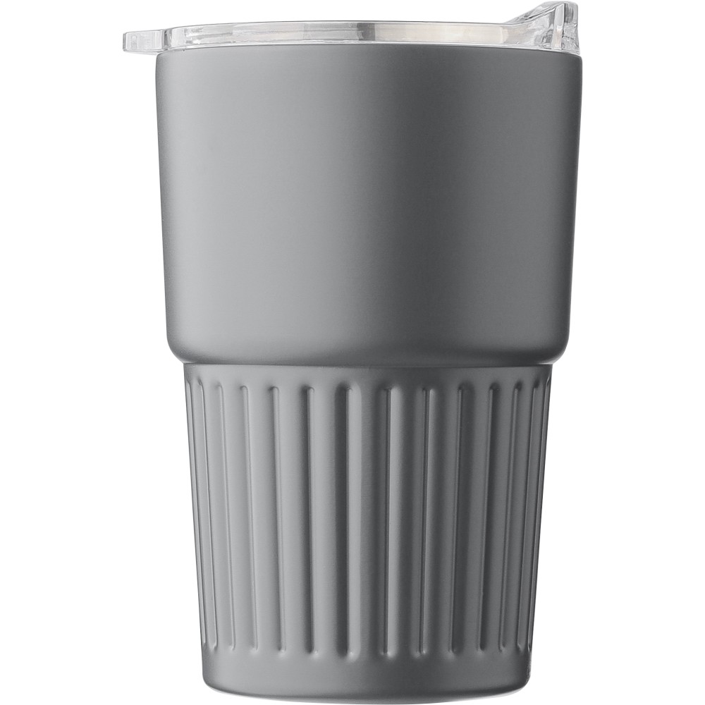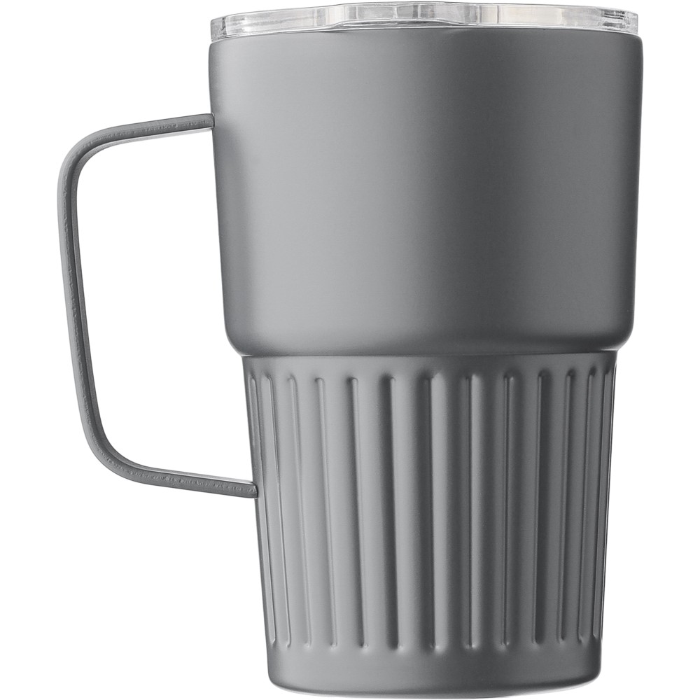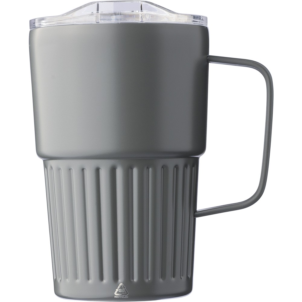 Újrahasznosított rozsdamentes acél útibögre, 450 ml. A belső 304-es, a külső 201-es rozsdamentes acélból készült, bordás markolattal és masszív fogantyúval, műanyag, csúszózáras fedéllel. Gravírozott újrahasznosított logó található a bögrén. Csomagolása barna papírdoboz. Emblémázás: Bögredekor, Gravírozás