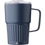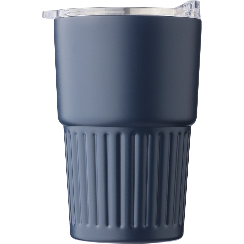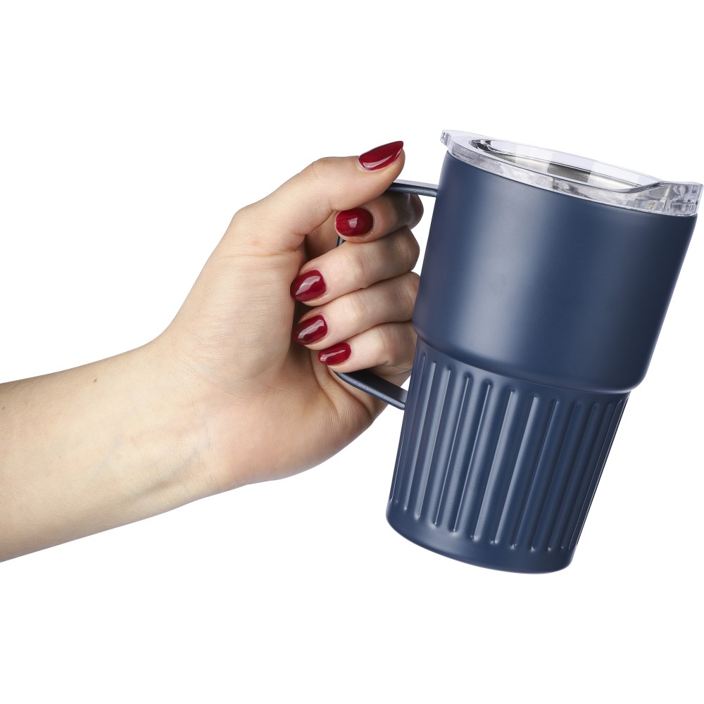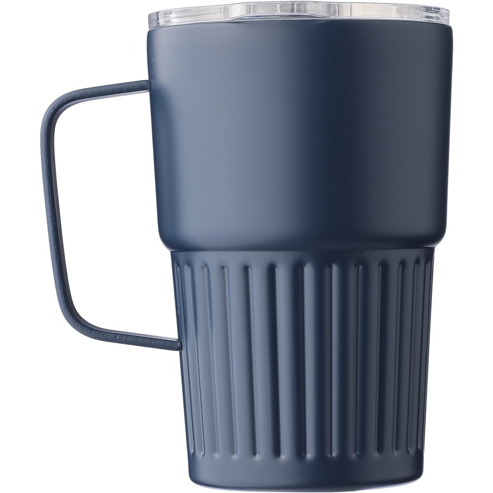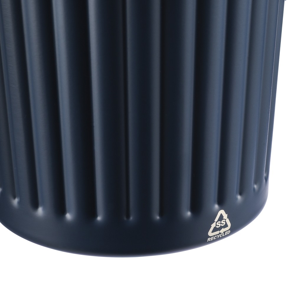 Újrahasznosított rozsdamentes acél útibögre, 450 ml. A belső 304-es, a külső 201-es rozsdamentes acélból készült, bordás markolattal és masszív fogantyúval, műanyag, csúszózáras fedéllel. Gravírozott újrahasznosított logó található a bögrén. Csomagolása barna papírdoboz. Emblémázás: Bögredekor, Gravírozás