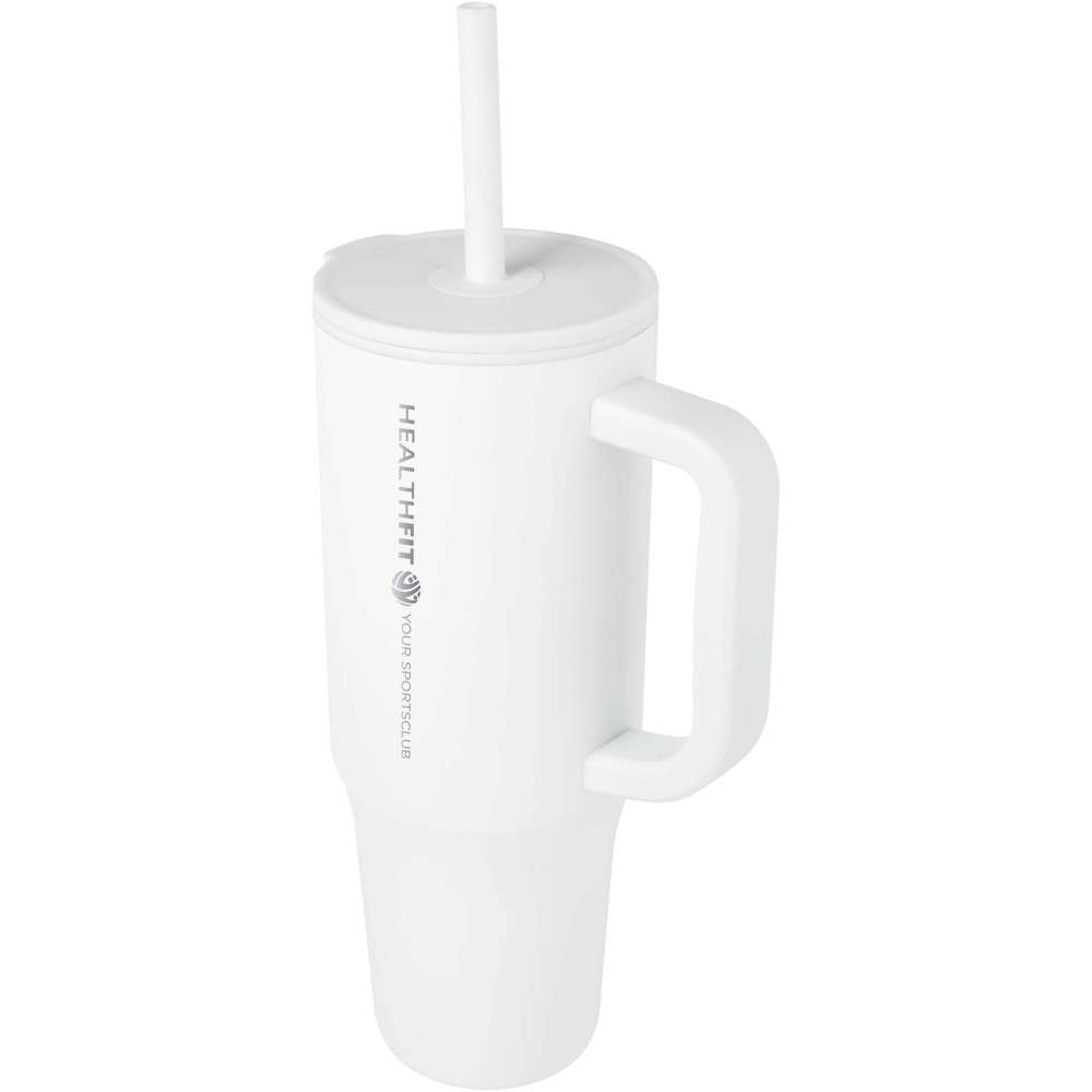Strapabíró külső fallal rendelkező tumbler, amely RCS tanúsítvánnyal rendelkező újrahasznosított rozsdamentes acélból készült, belső fala pedig műanyag. Beépített, élelmiszeripari szilikon szívószállal és fröccsenésgátló, rányomható tetővel a kényelmes ivás érdekében. Meleg italokhoz is használható, de ezek fogyasztása szívószállal nem ajánlott. A forró italok hűtéséhez javasolt a tető eltávolítása. Űrtartalom: 900 ml. Kézi mosogatás javasolt. Emblémázás: Gravírozás