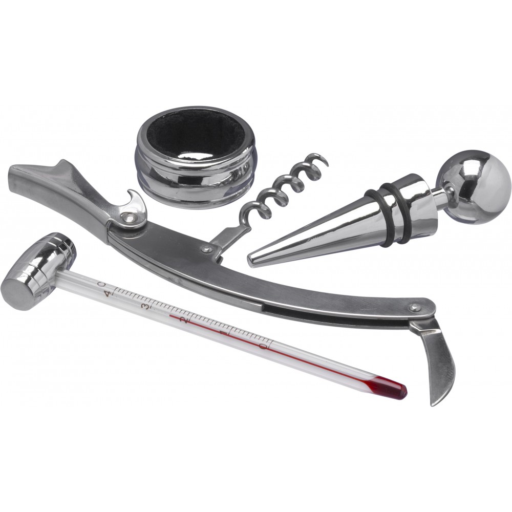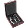 Boroskészlet fa díszdobozban. Üvegdugó, cseppfogó, borhőmérő, pincérbicska. Emblémázás: Gravírozás, Tamponnyomás, UV nyomtatás