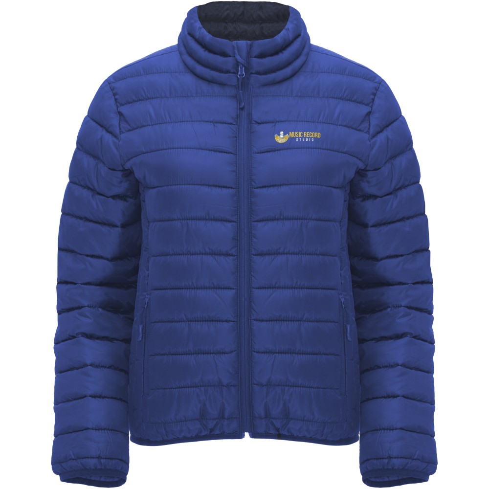 Női, karcsúsított, steppelt dzseki tollszerű tapintású töltettel, tasakkal. Fordított cipzárak, színben illeszkedő állvédővel és cipzárral. Két cipzáras elülső zseb. Gumis szegély a galléron, a kézelőn és az aljon. Kontrasztos színű bélés. Könnyű és összehajtható ruhadarab. Vízálló. Szélálló. 100% poliészter, 290 g/m2. Bélés és töltet: 100% poliészter. Emblémázás: Hímzés