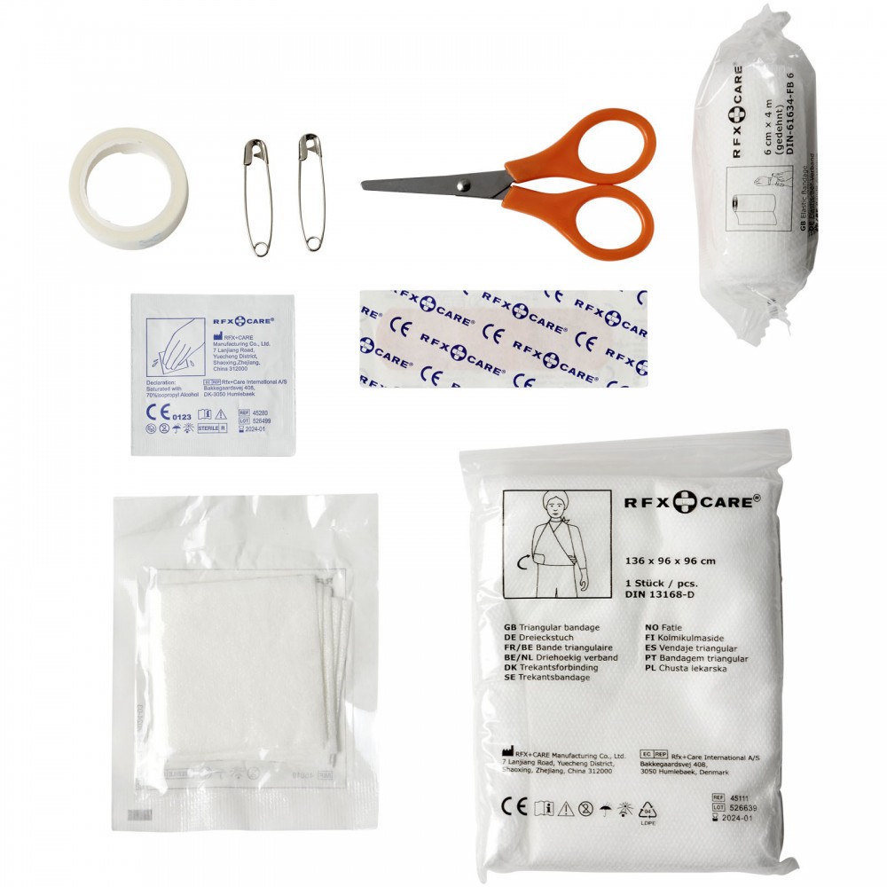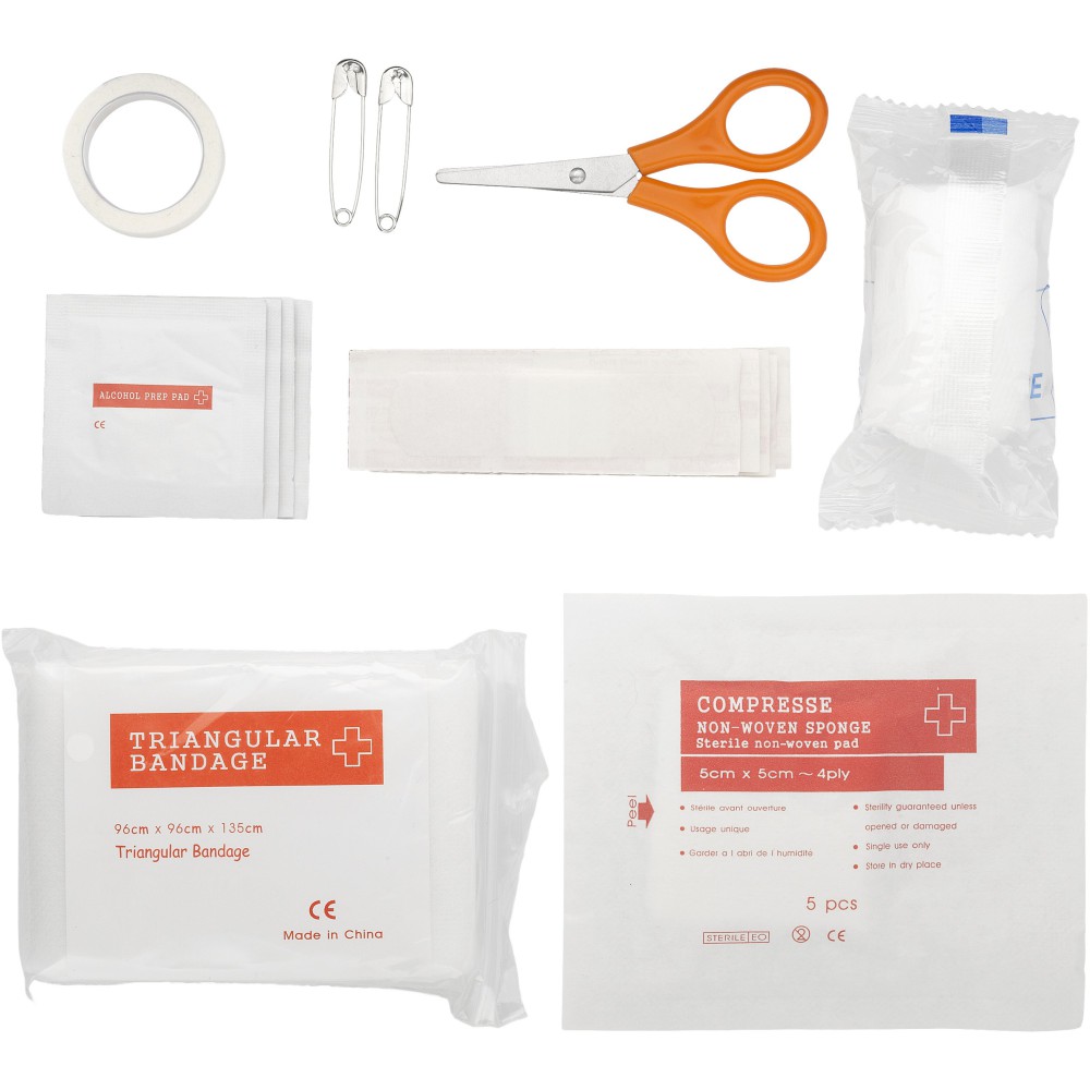16 db-os készlet. Az EVA tasakban 4 alkoholos párna, 1 préselt szivacs, 5 ragtapasz, 1 papírtapasz, 1 kötszer, olló, 2 tű és 1 háromszög kötszer. EN13485 szabványnak megfelelő. Emblémázás: Szitanyomás