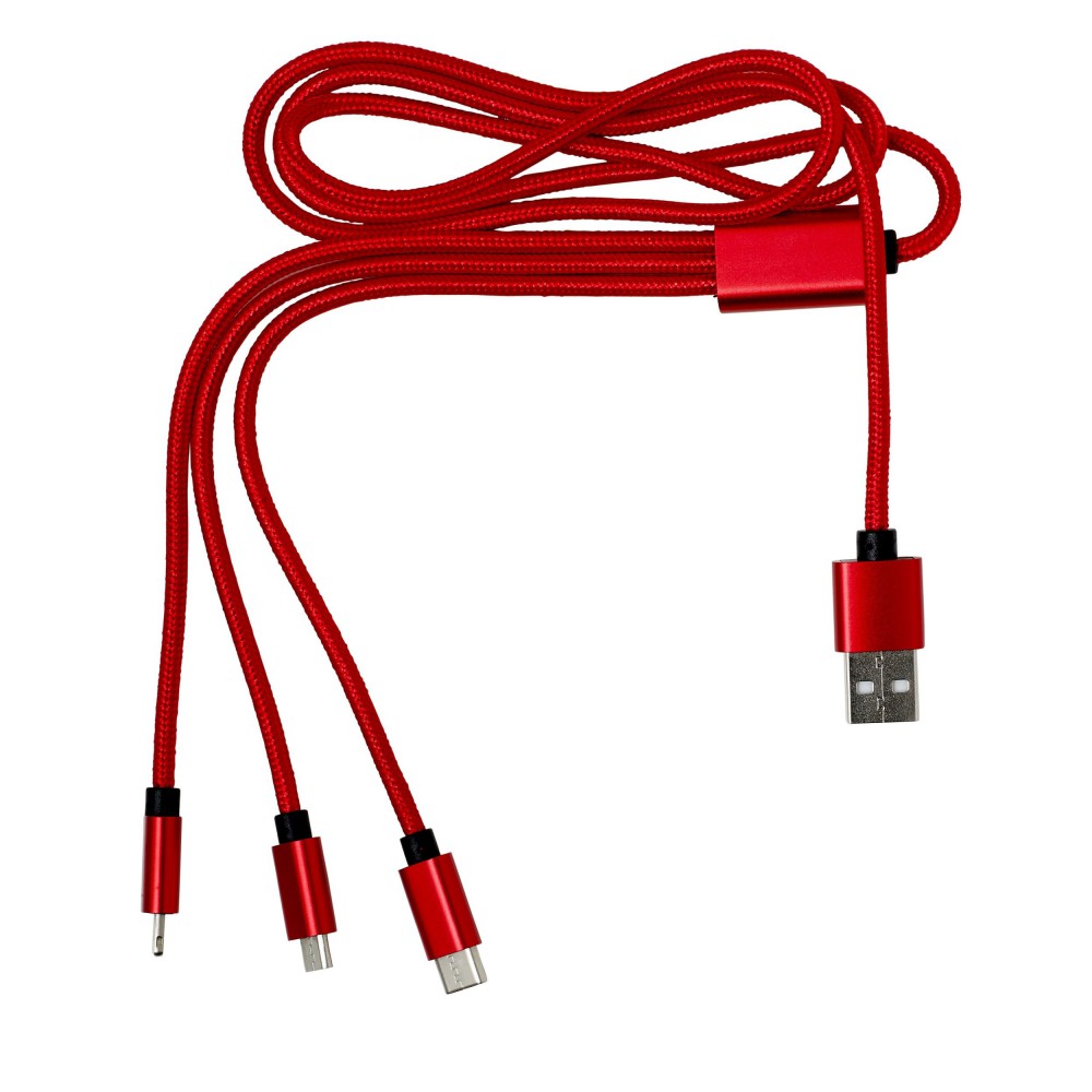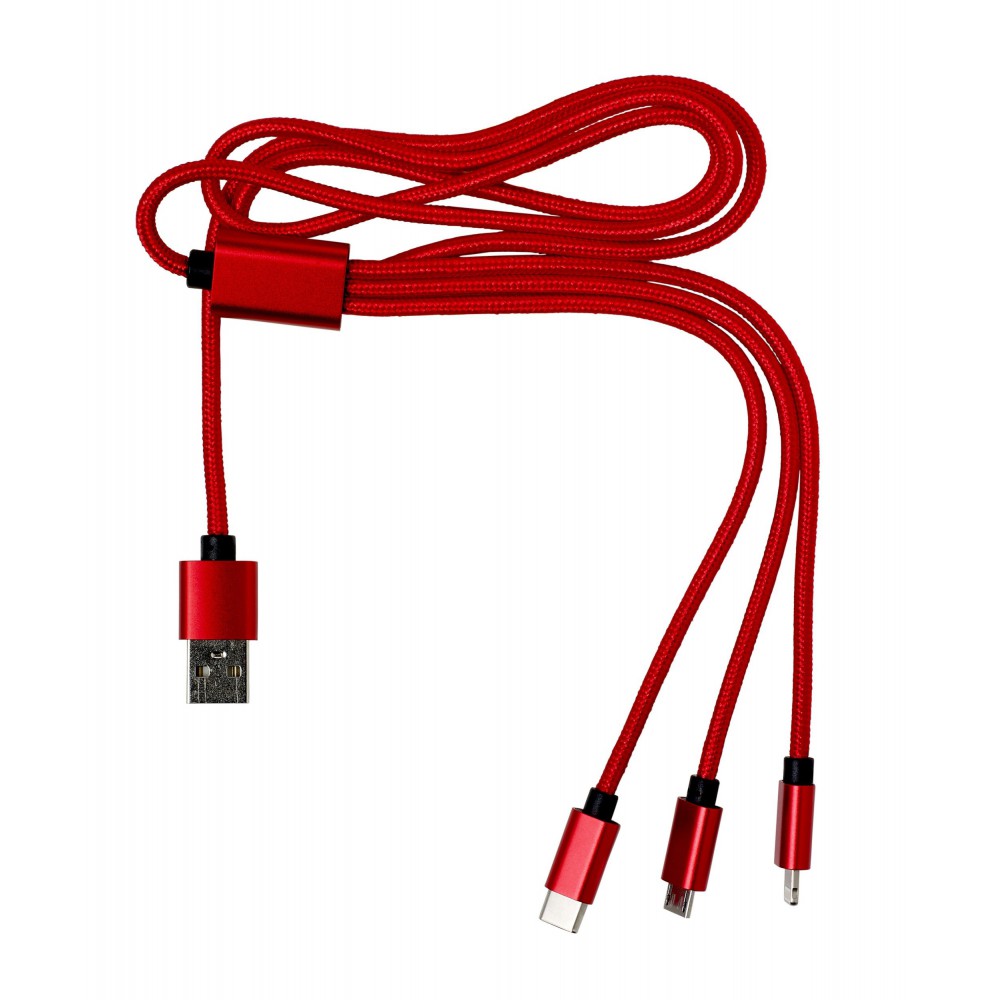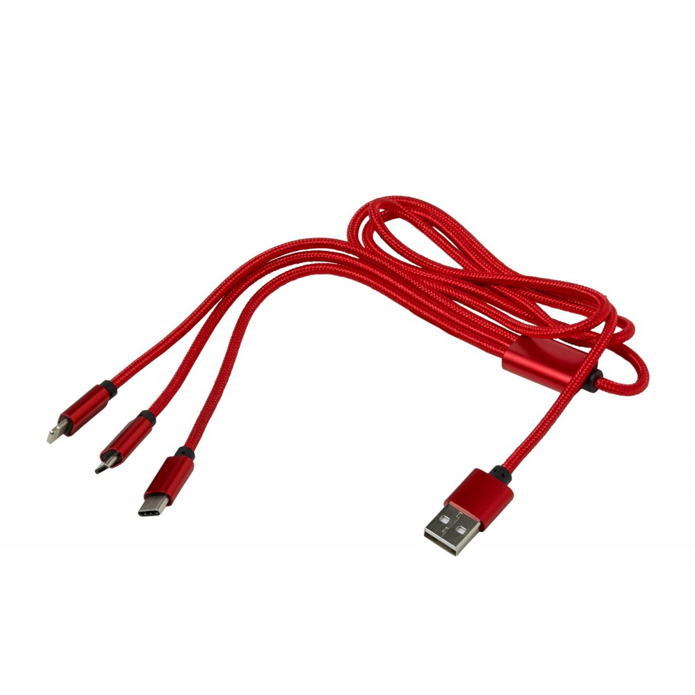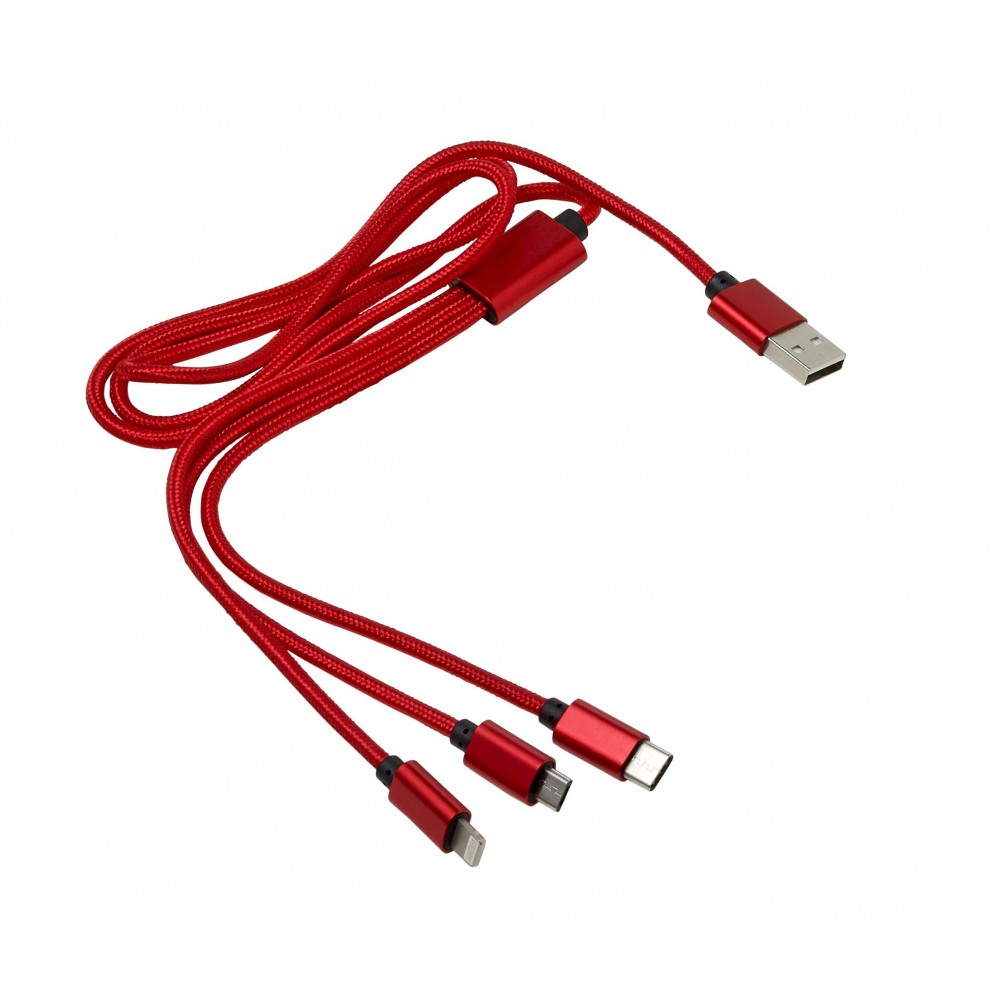 Töltőkábel az egyik végén USB csatlakozóval, a másik végén mikro USB, USB-C és Lightning csatlakozókkal. Nylon. Emblémázás: Gravírozás, Tamponnyomás
