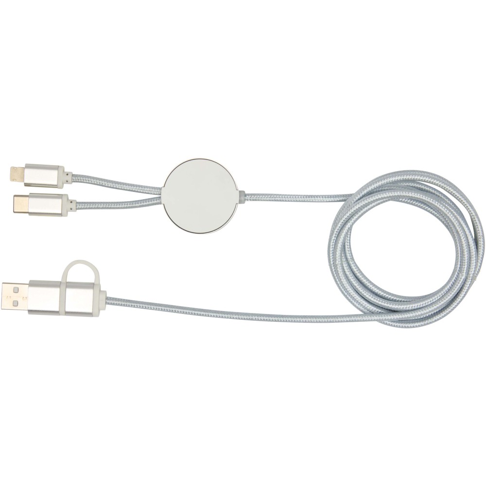 Az Alasia 5 az 1-ben adat- és 27W-os gyorstöltő kábel tartós és elegáns újrahasznosított alumíniumból és műanyagból készült. A kábel USB-A és Type-C bemeneti csatlakozókkal, valamint Type-C és Lightning/Micro USB kombinált kimeneti csatlakozóval rendelkezik. Az USB-A?USB-C kapcsolat maximális teljesítménye 27W, míg az összes többi kapcsolat maximális teljesítménye 15W. Kompatibilis a CarPlay és az Android Auto rendszerekkel. Akár otthon, az irodában vagy útközben használod, az Alasia kábel teljesítményt és stílust garantál. Kábel hossza: 150 cm. Emblémázás: Gravírozás, Tamponnyomás
