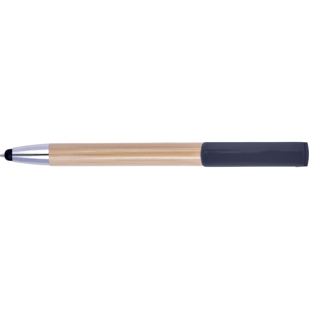 Golyóstoll és érintő kék tollbetéttel, műanyag klipsszel és nyomógombbal. A klipsz nyomógombként funkcionál, és okostelefon-állványként is használható. ABS, bambusz. Emblémázás: Tamponnyomás, UV nyomtatás