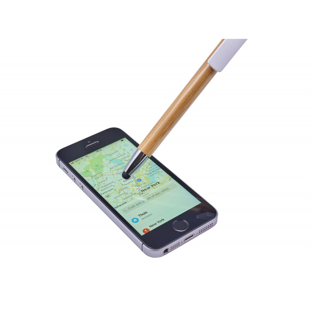Golyóstoll és érintő kék tollbetéttel, műanyag klipsszel és nyomógombbal. A klipsz nyomógombként funkcionál, és okostelefon-állványként is használható. ABS, bambusz. Emblémázás: Tamponnyomás, UV nyomtatás