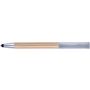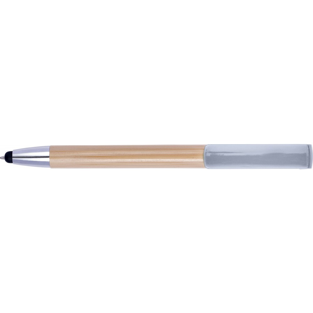 Golyóstoll és érintő kék tollbetéttel, műanyag klipsszel és nyomógombbal. A klipsz nyomógombként funkcionál, és okostelefon-állványként is használható. ABS, bambusz. Emblémázás: Tamponnyomás, UV nyomtatás
