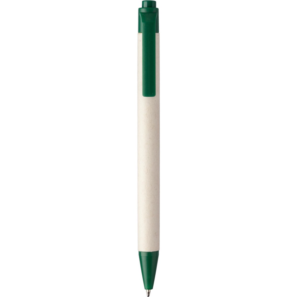 Újrahasznosított tejeskartonból készült golyóstoll újrahasznosított ABS műanyag részekkel. Újrahasznosított ABS logó és újrahasznosított tejeskarton logó jelzi a felhasznált anyagok milyenségét. Kék tollbetéttel. Emblémázás: Tamponnyomás
