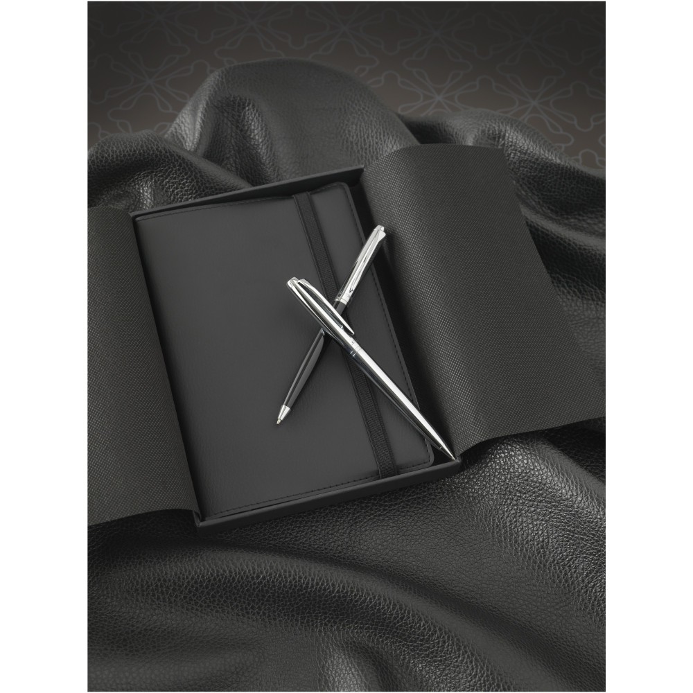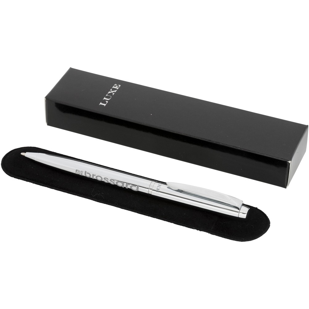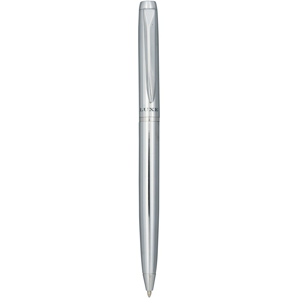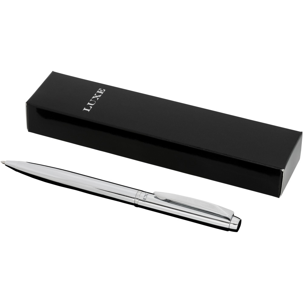 Kifinomult tervezésű golyóstoll krómozott vagy színes alsó résszel és fényes krómozott részletekkel. Prémium minőségű fekete tollbetéttel. Csomagolása Luxe ajándékdoboz.Fém. Emblémázás: Gravírozás, Tamponnyomás