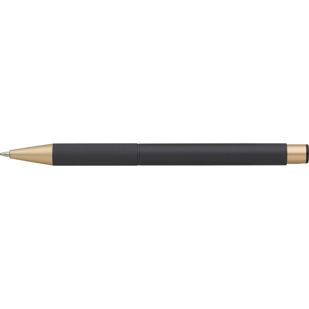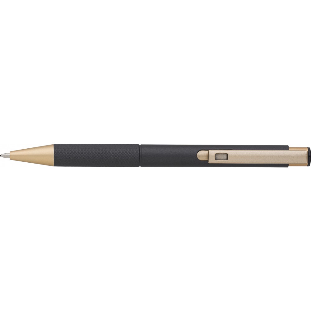 Alumínium golyóstoll matt arany részletekkel, kék tollbetéttel. Emblémázás: Gravírozás, UV nyomtatás
