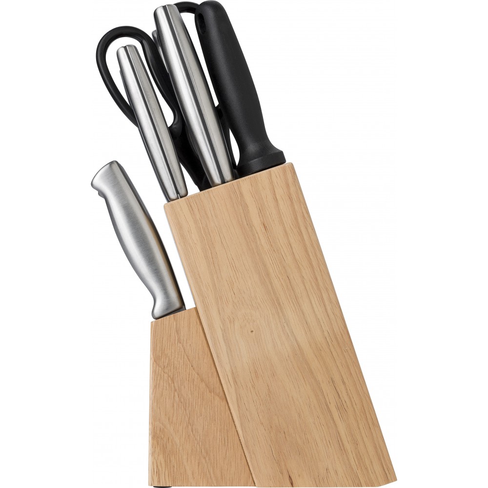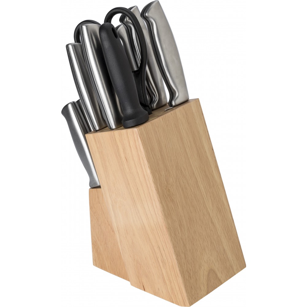 Konyhai készlet rozsdamentes acélból és PP műanyagból. A gumifa talp 13 db konyhai eszközt tartalmaz: olló, élező és különböző kések. Emblémázás: Gravírozás, Tamponnyomás