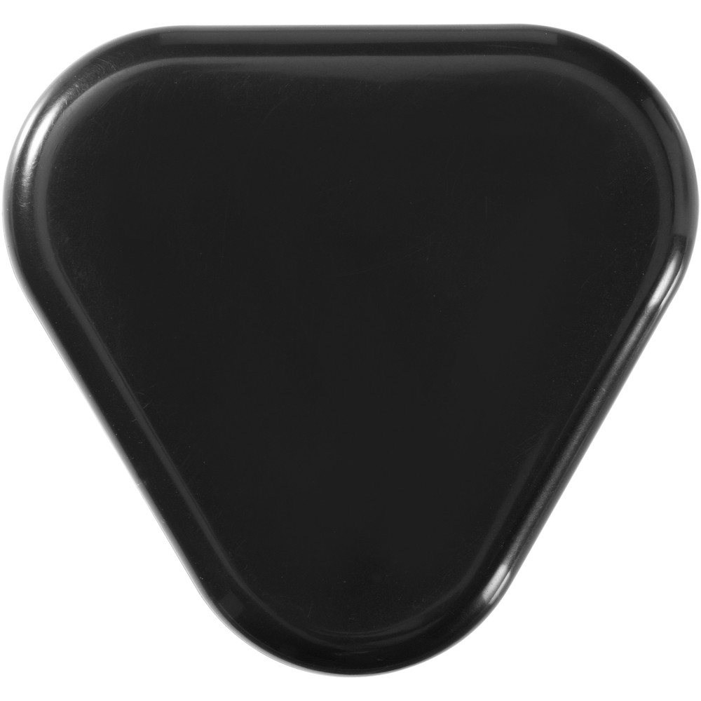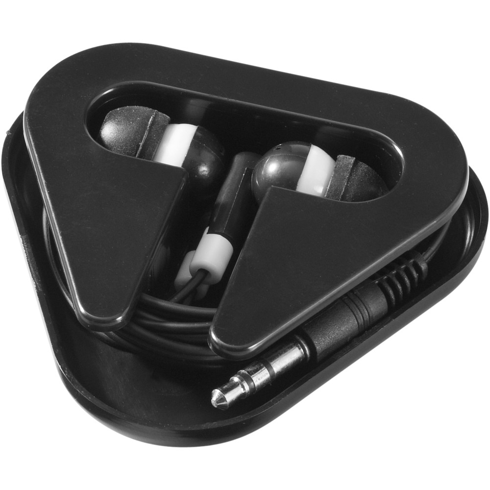 Háromszög alakú műanyag kábeltartó. Minden szabványos 3,5 mm-es audio csatlakozóval használható. Emblémázás: Tamponnyomás, UV nyomtatás