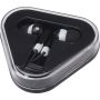 A Rebel fülhallgató egyszerű és praktikus megoldás, amely bármilyen 3,5 mm-es audio csatlakozóval rendelkező eszközzel használható. A fülhallgató újrahasznosított műanyagból készült, háromszög alakú kábeltartó tokban érkezik, amely megóvja a külső sérülésektől. Emblémázás: Tamponnyomás, UV nyomtatás