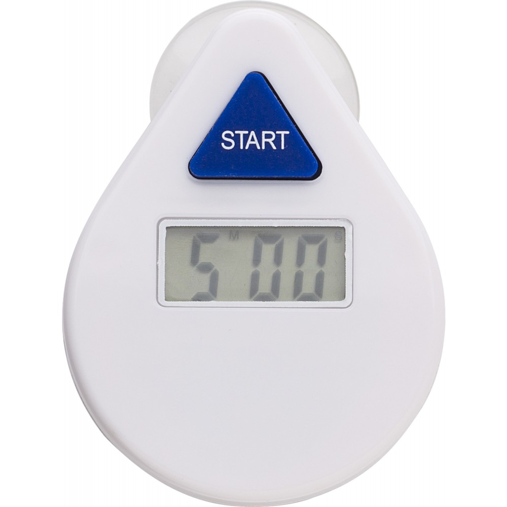 Digitális zuhanyidő-mérő tapadókoronggal és nyomógombbal az elülső oldalon. ABS műanyag. Emblémázás: Tamponnyomás