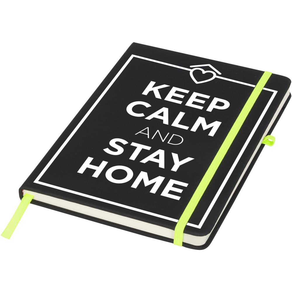 Puha felületű füzet színes gumipánttal, könyvjelzővel és tullhurokkal. 96 krémszínű vonalas lapot tartalmaz. Emblémázás: Szitanyomás, Tamponnyomás, UV nyomtatás