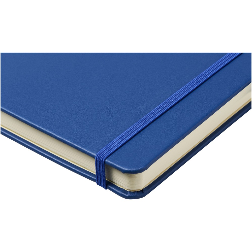 Műbőr A5-ös (14,2 cm x 21,4 cm) jegyzetfüzet gumiszalaggal, szalagjelölővel, tollhurokkal és harmonika hátsó zsebbel. 96 db vonalas krémszínű lapot tartalmaz (80 g/m2). Emblémázás: Tamponnyomás, UV nyomtatás