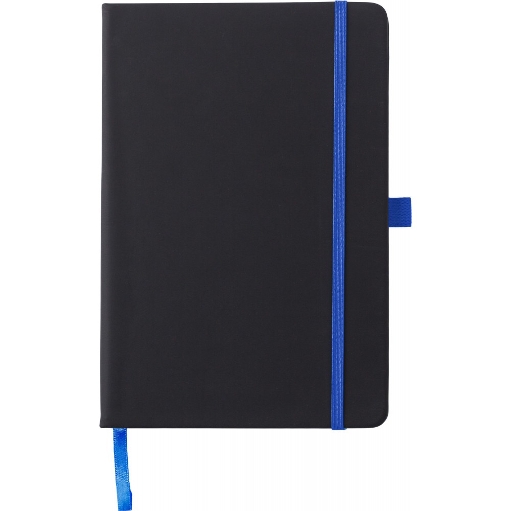 A5 füzet 96 vonalas lappal, könyvjelzővel, gumis zárópánttal. Lézergravírozás után a gravírozott felület színe megegyezik a gumipánt színével. PU anyag. Emblémázás: Tamponnyomás, UV nyomtatás