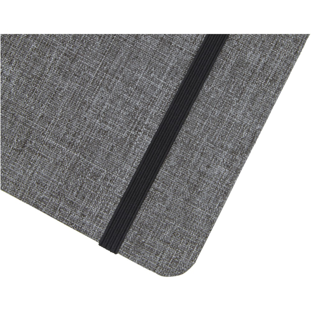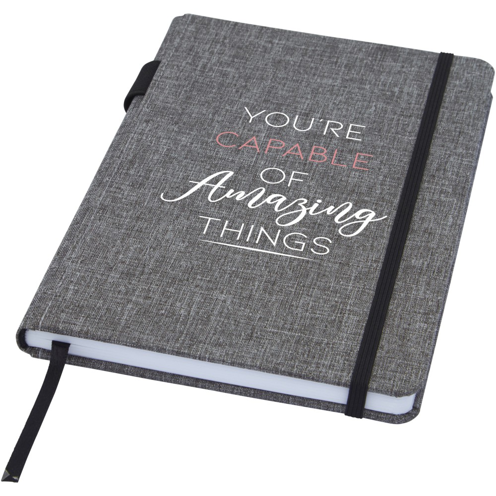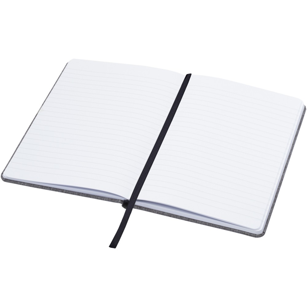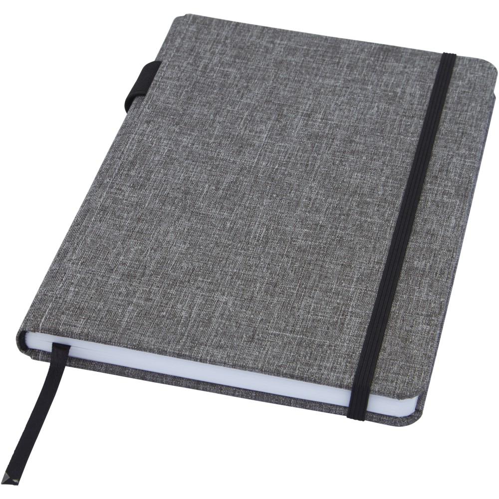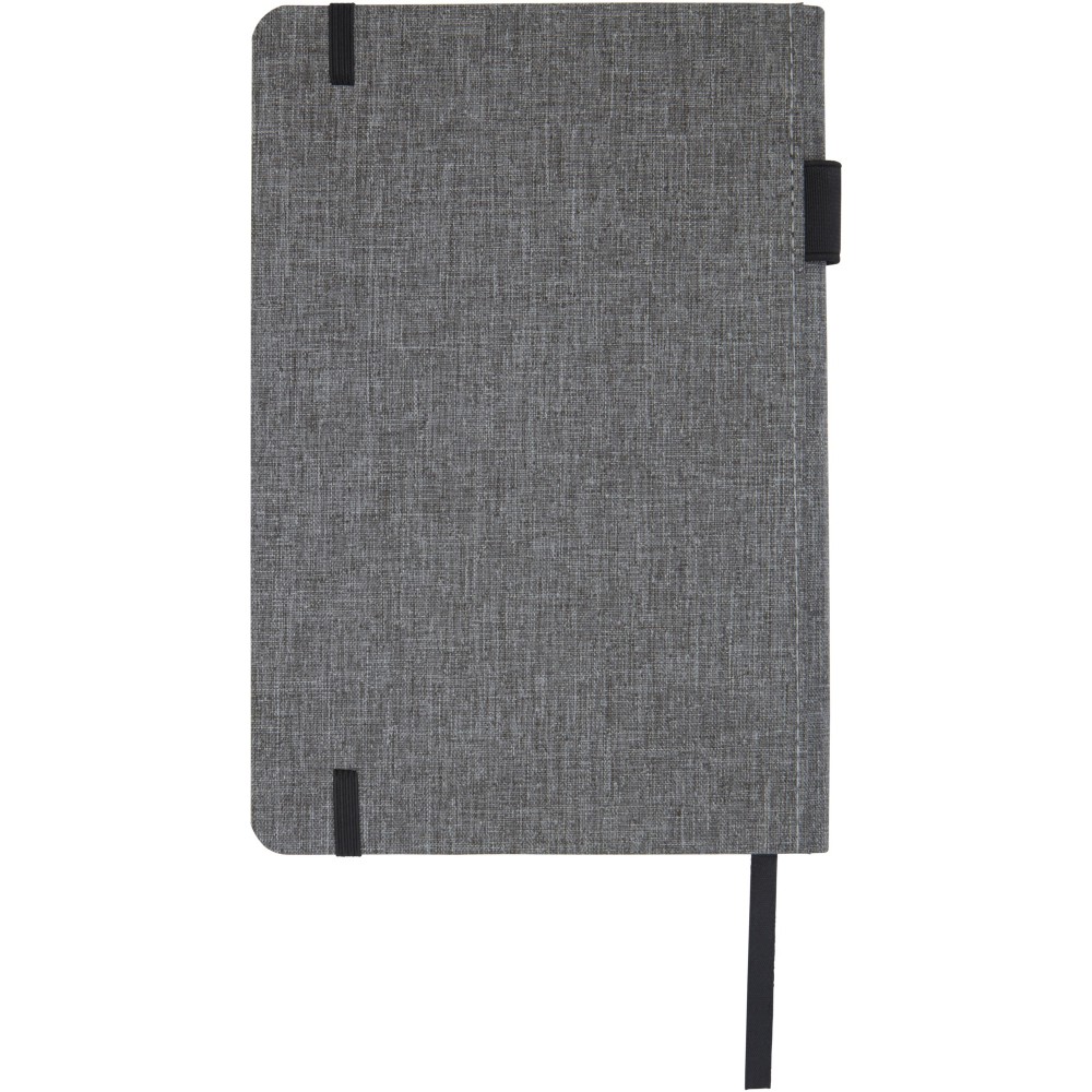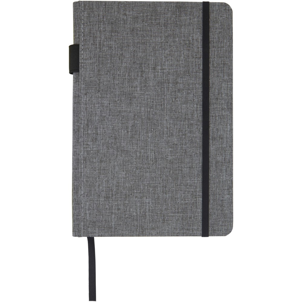 A5 méretű füzet tollhurokkal és könyvjelzővel, RPET polietilén szövetből. 96 lap 70 g / m2 újrahasznosított vonalas lap. Csomagolás: karton palást. Újrahasznosított műanyag, újrahasznosított papír. Emblémázás: Szitanyomás