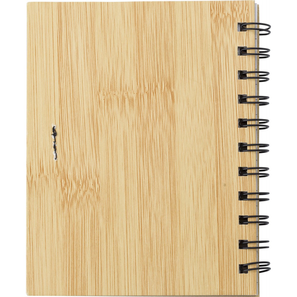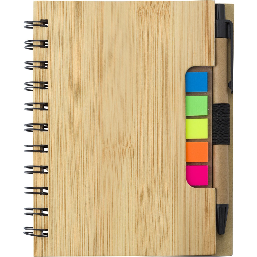 Bambusz mintázatú spirálfüzet 70 vonalas lappal, index jelölőkkel, tollal (kék tollbetéttel). Emblémázás: Tamponnyomás
