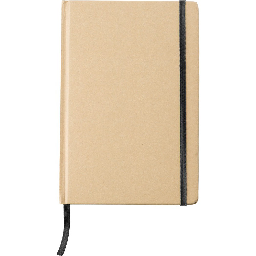 Újrahasznosított kartonból készült A5-ös jegyzetfüzet 80 vonalas lappal. Gumis záródás és könyvjelző szalag. Emblémázás: Tamponnyomás, UV nyomtatás