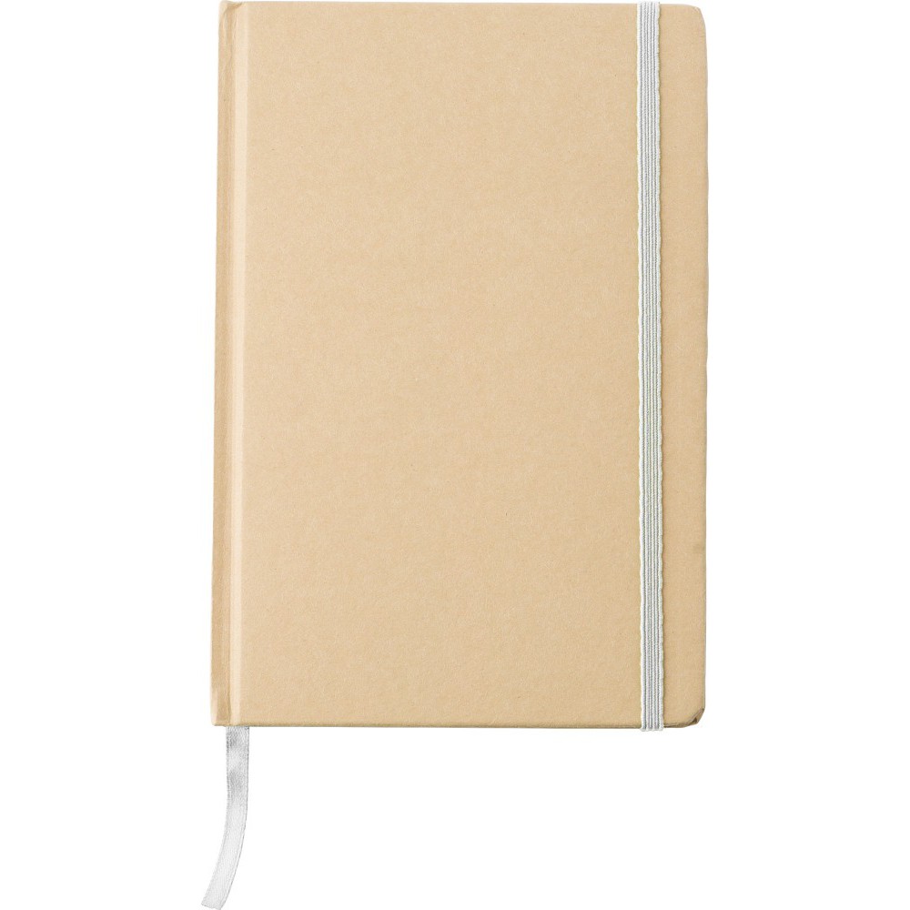 Újrahasznosított kartonból készült A5-ös jegyzetfüzet 80 vonalas lappal. Gumis záródás és könyvjelző szalag. Emblémázás: Tamponnyomás, UV nyomtatás