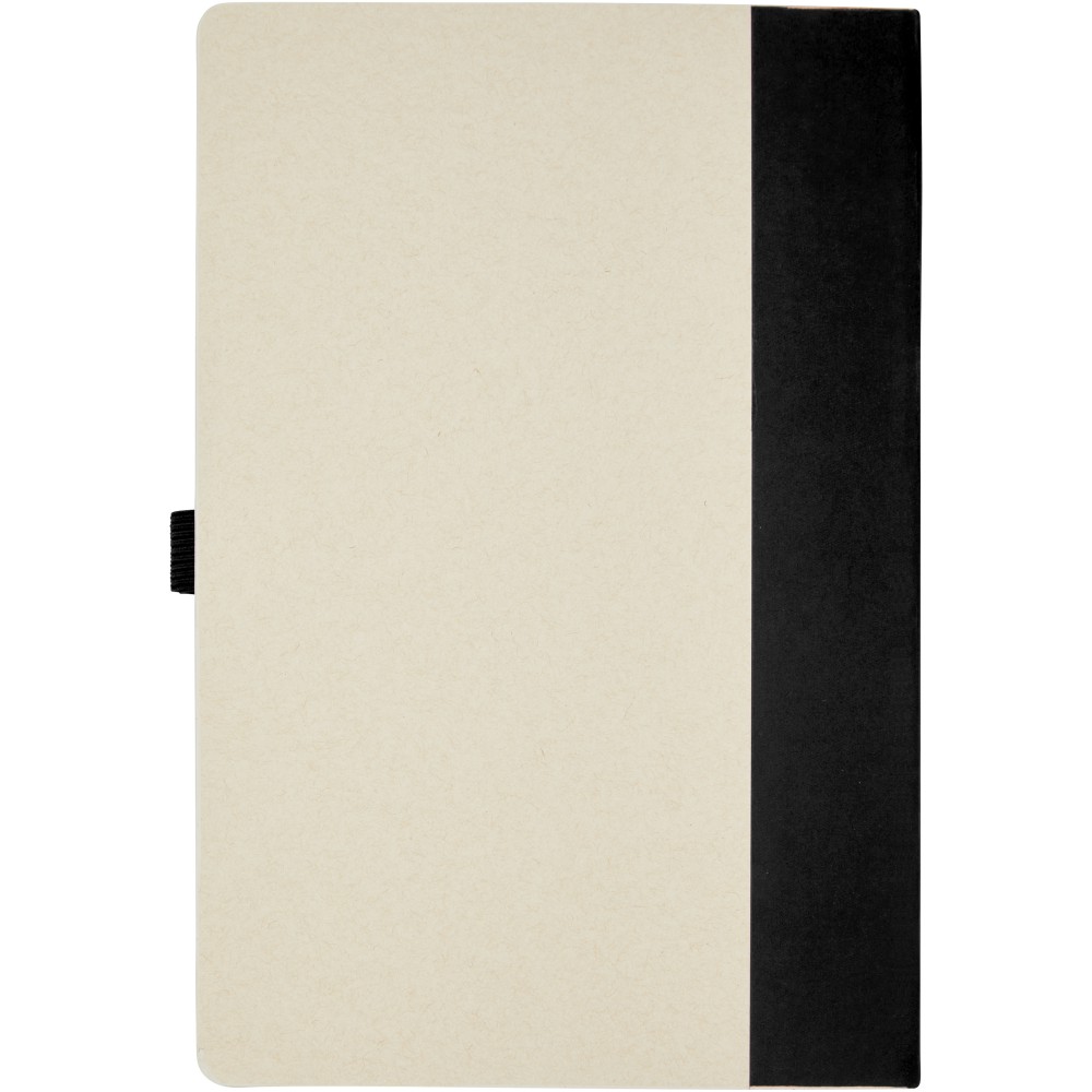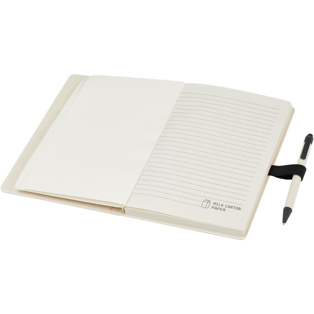 A5 méretű füzet és golyóstoll készlet. A jegyzetfüzet 80 vonalas lapot (80 g/m2) tartalmaz, amelyek újrahasznosított tejes kartondobozokból készülnek (akár 70%), színes papírgerinccel és egy tollhurokkal. A tollhurokban egy nyomógombos golyóstoll található a jegyzetfüzet színéhez illő színben. A toll teste ugyanabból az újrahasznosított anyagból készült, a gomb, a klipsz és a hegy pedig színes PLA műanyagból készült. A toll fekete tollbetéttel érkezik. A használt tejesdobozokat összegyűjtik, válogatják, feldolgozzák és papírrá alakítják, így a hulladékból hasznos termék készül. Emblémázás: Szitanyomás, Tamponnyomás