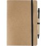 Újrahasznosított karton jegyzetfüzet 60 sima lappal. Tartalmazza a hozzáillő karton/szalma tollat kék tollbetéttel. Gumis összefogó pánt és tollhurok. Emblémázás: Szitanyomás, Tamponnyomás, UV nyomtatás
