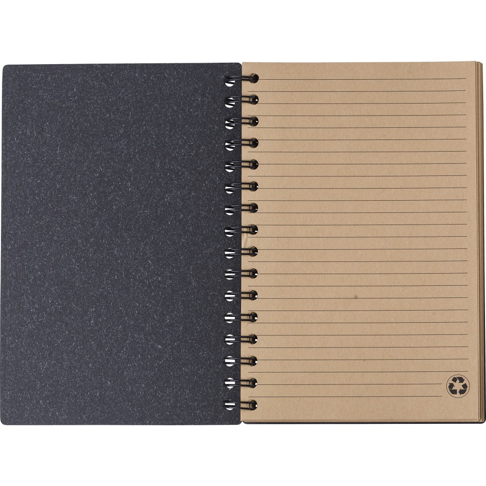 Újrahasznosított kartonból készült, keményfedeles spirálfüzet 80 vonalas, újrahasznosított barna papírlappal. Lapok minősége: 65 g/m2. Az újrahasznosított alapanyagra utaló logó minden lapon látható. Emblémázás: Tamponnyomás