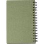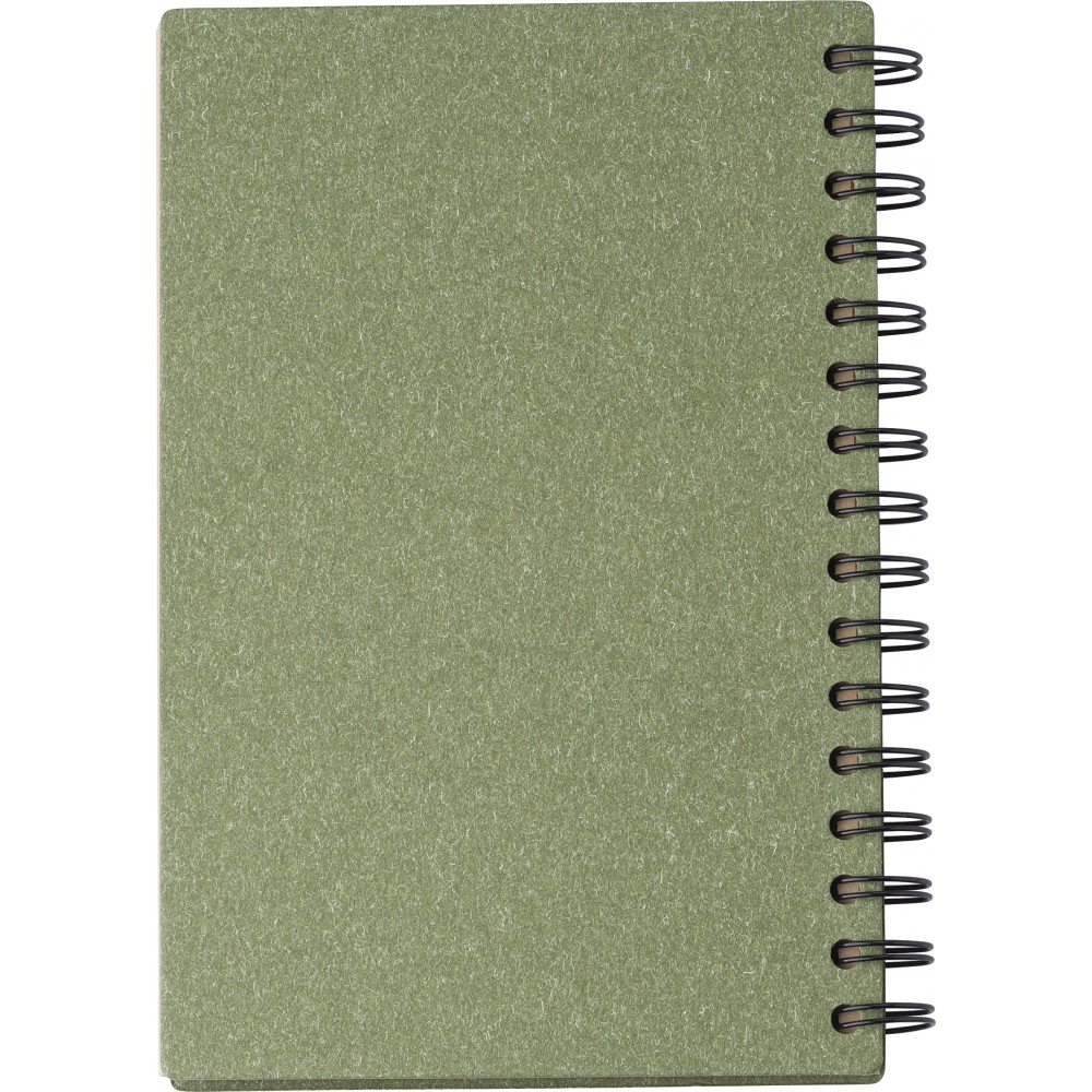 Újrahasznosított kartonból készült, keményfedeles spirálfüzet 80 vonalas, újrahasznosított barna papírlappal. Lapok minősége: 65 g/m2. Az újrahasznosított alapanyagra utaló logó minden lapon látható. Emblémázás: Tamponnyomás