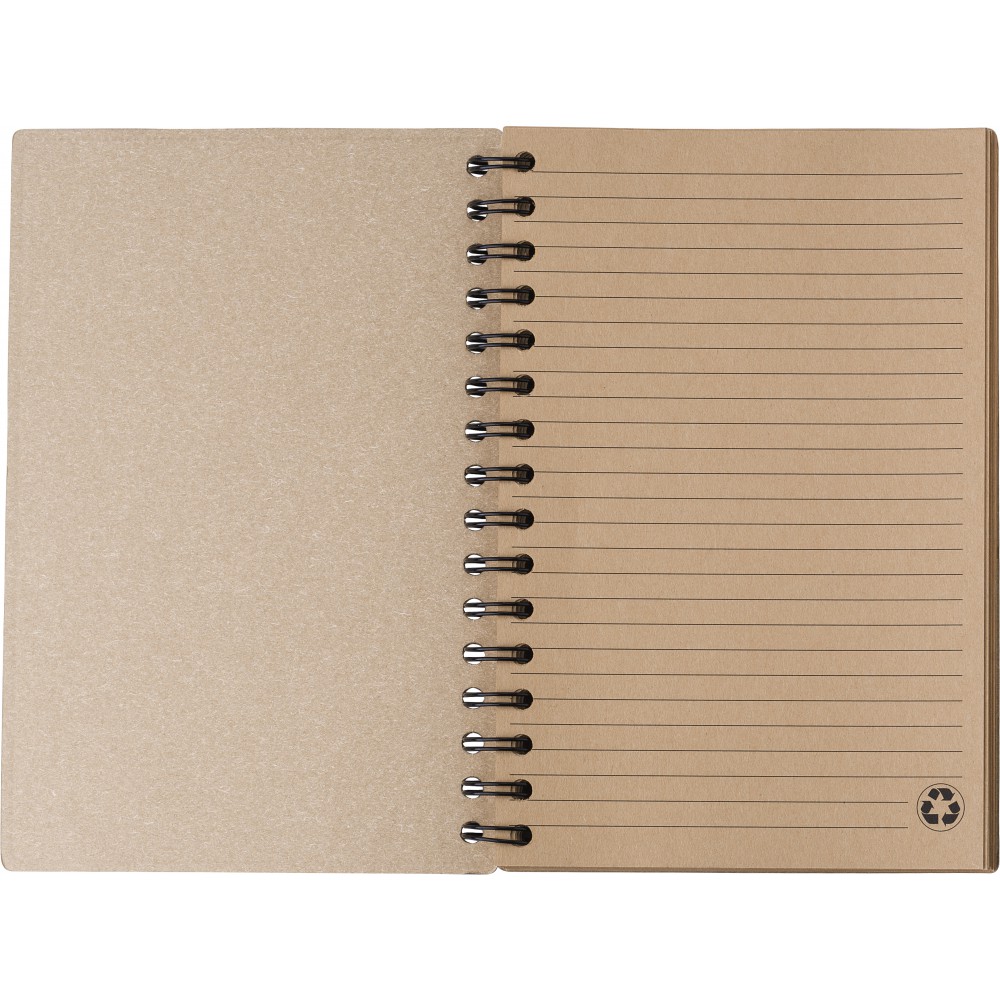 Újrahasznosított kartonból készült, keményfedeles spirálfüzet 80 vonalas, újrahasznosított barna papírlappal. Lapok minősége: 65 g/m2. Az újrahasznosított alapanyagra utaló logó minden lapon látható. Emblémázás: Tamponnyomás