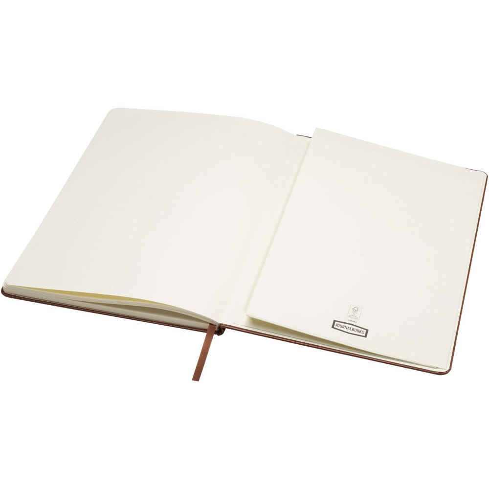 Ez az exkluzív kivitelű, klasszikus stílusú, keményfedeles, gumiszalaggal záródó, 80 lapos (80 g/m2), vonalas jegyzetfüzet (A4 méret) ideális jegyzetek készítéséhez és megosztásához. A hátoldalán kihúzható zsebbel a kisebb jegyzetek tárolásához. Journalbooks díszdobozban. Emblémázás: Tamponnyomás, UV nyomtatás