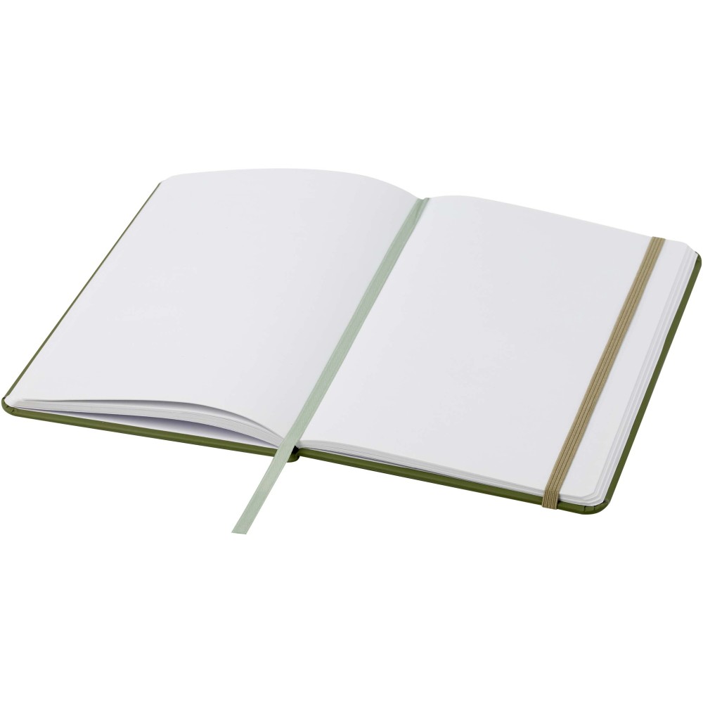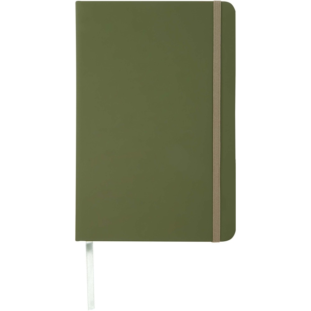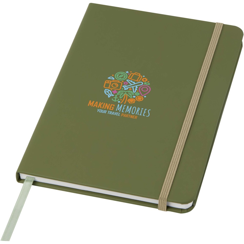 A5 jegyzetfüzet színben hozzáillő gumipánttal és jelölőszalaggal. 96 lapos.( (60g/m2). Sima lapok. Emblémázás: Szitanyomás, Tamponnyomás, UV nyomtatás