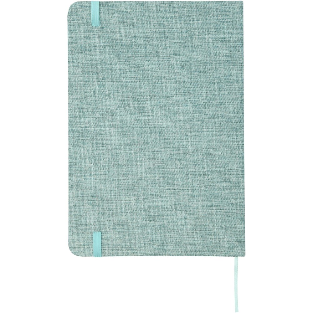 Kemény fedeles A5 jegyzetfüzet újrahasznosított pamutból, 80 soros 70 g/m2 papírral. A jegyzetfüzet gumis záródással, szalaggal és lekerekített sarkokkal rendelkezik. Emblémázás: Szitanyomás