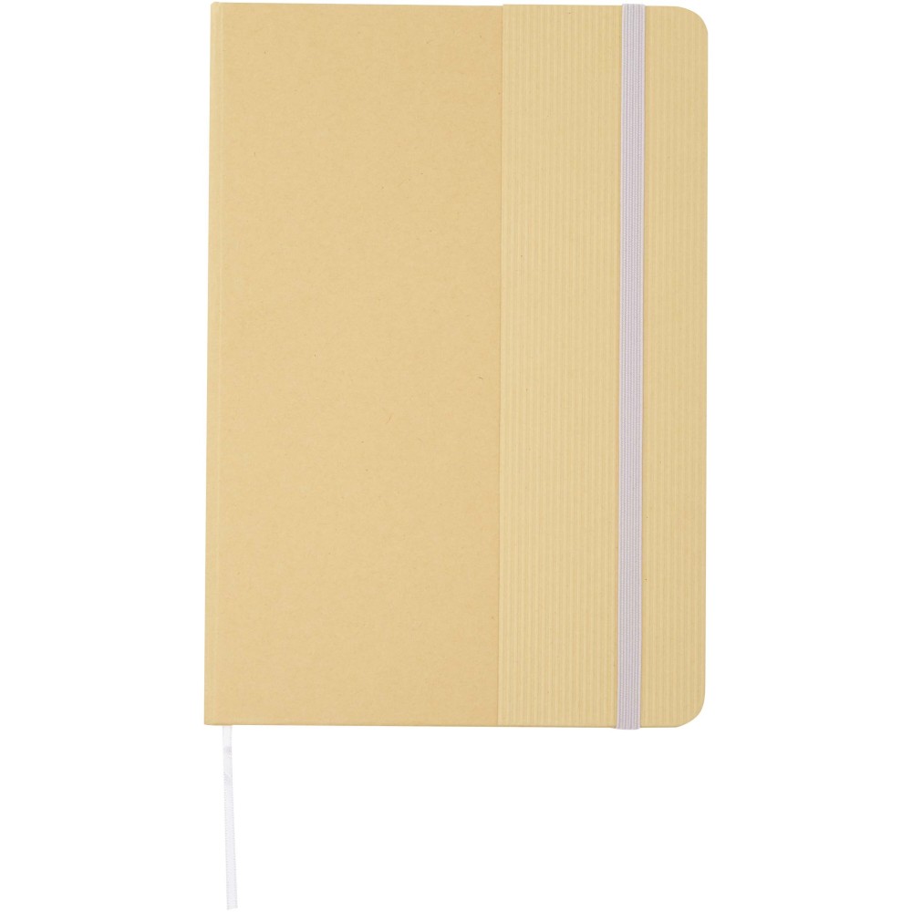 Kemény fedeles A5 jegyzetfüzet újrahasznosított kartonból, 80 soros, 70 g/m2 papírlappal. A jegyzetfüzet gumis záródással, szalaggal és lekerekített sarkokkal rendelkezik. Emblémázás: Szitanyomás, Tamponnyomás