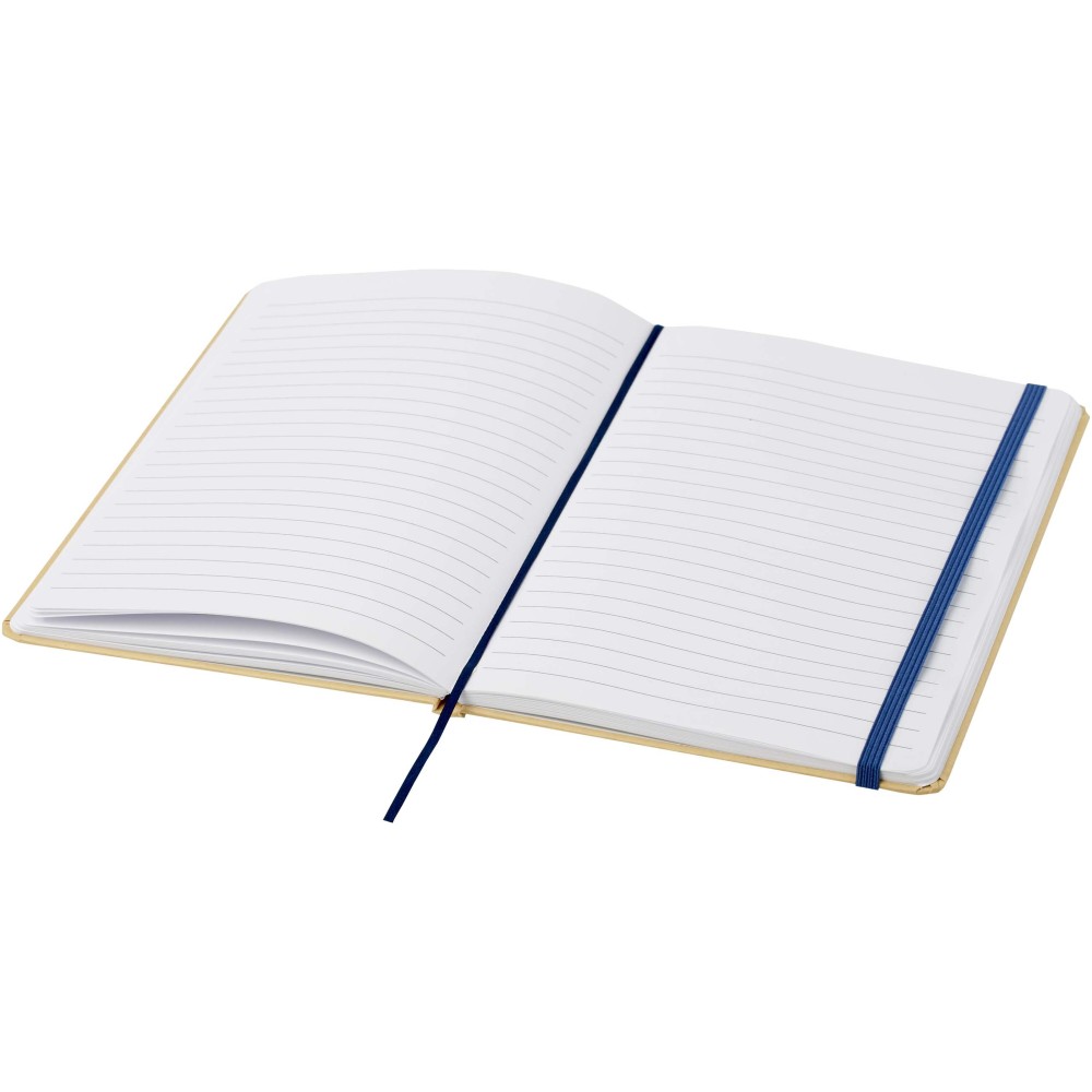 Kemény fedeles A5 jegyzetfüzet újrahasznosított kartonból, 80 soros, 70 g/m2 papírlappal. A jegyzetfüzet gumis záródással, szalaggal és lekerekített sarkokkal rendelkezik. Emblémázás: Szitanyomás, Tamponnyomás