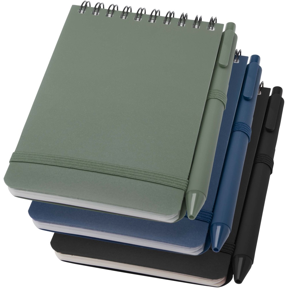 Thalaasa A6 keményfedeles jegyzetfüzet óceánból származó újrahasznosított műanyagból készült, és 80 vonalas, 70 g/m2 krémszínű lapot tartalmaz. A jegyzetfüzet lekerekített sarkokkal, elasztikus zárással és tolltartóval rendelkezik. A fekete tintával író golyóstoll szintén óceánból származó újrahasznosított műanyagból készült. Íráshossz: 1000 méter. Tollhegy mérete: 1,0 mm. Emblémázás: Tamponnyomás