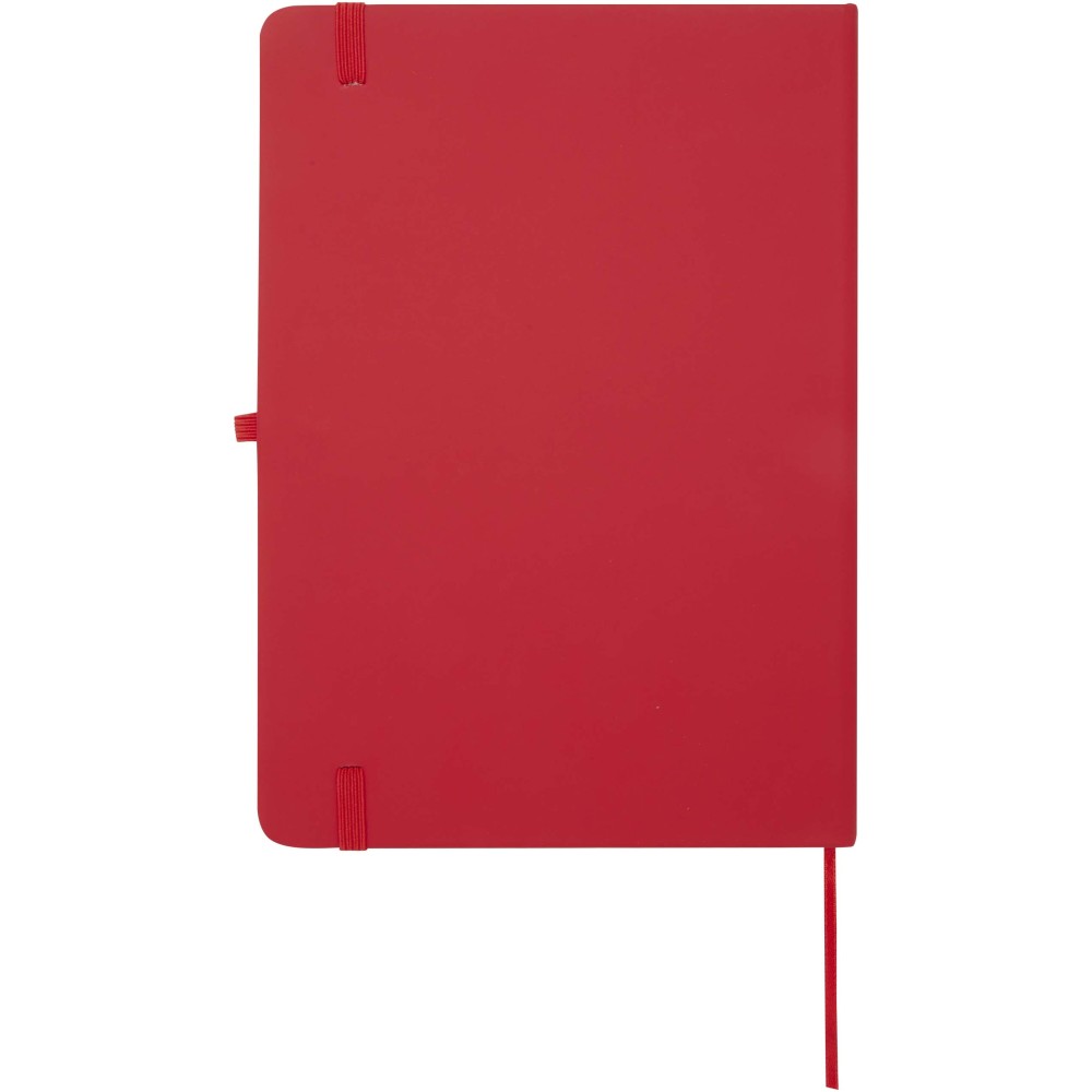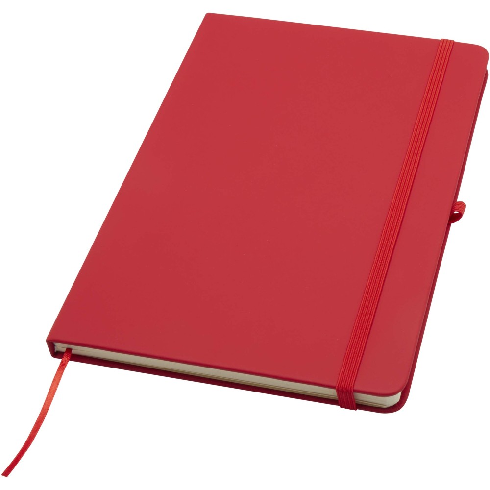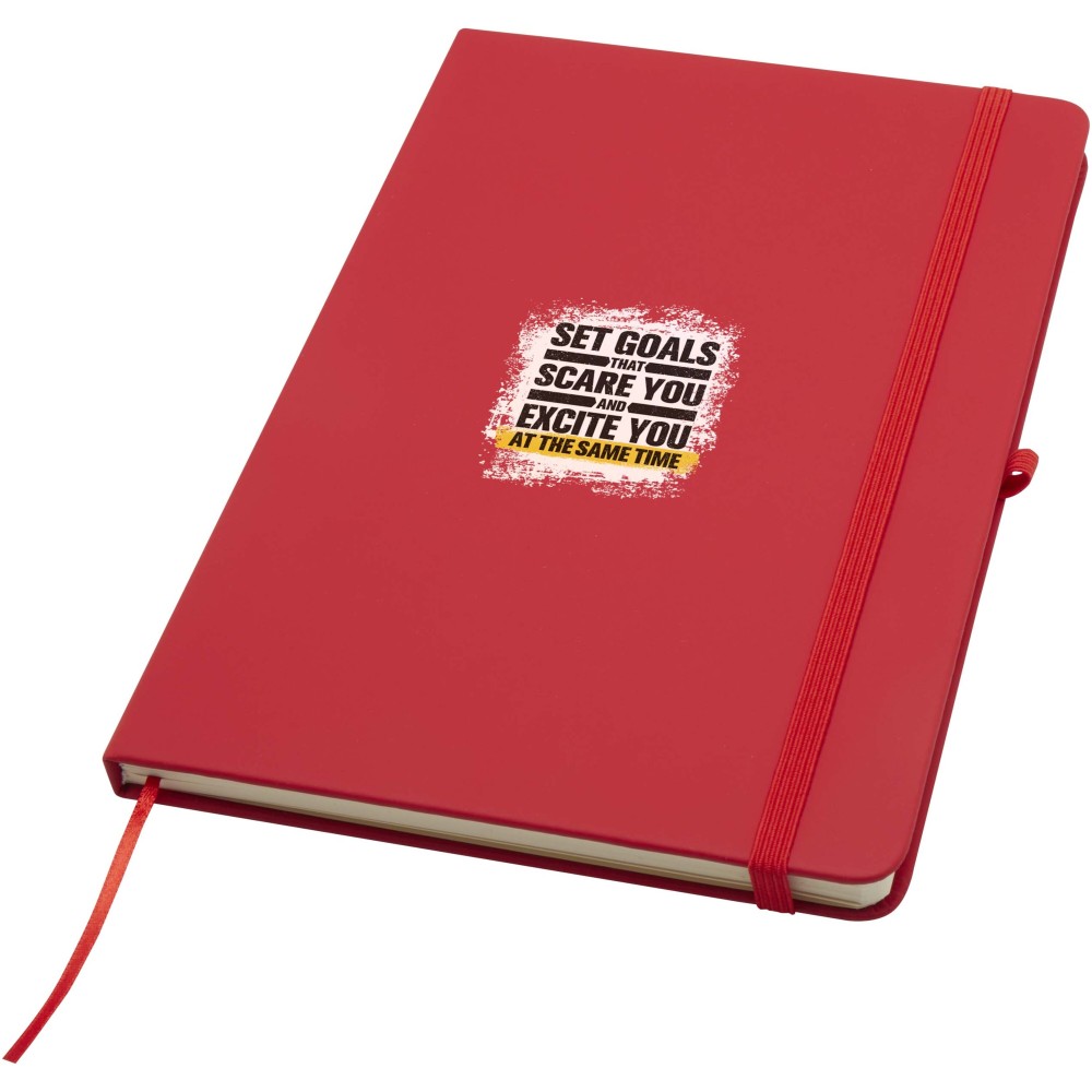A Spectrum Plus A5 keményfedeles jegyzetfüzet lekerekített sarkokkal nemcsak az irodai mindennapok elengedhetetlen kelléke, hanem remek lehetőség márkád népszerűsítésére is. A jegyzetfüzet puha tapintású borítóval rendelkezik és 80 vonalas, krémszínű, 70 g/m2-es lapból áll, amely tökéletes gyors ötletek vagy hosszabb jegyzetek rögzítésére. A jegyzetfüzet tolltartó hurokkal, gumiszalagos záródással, könyvjelzővel és harmonikazsebbel van ellátva. Emblémázás: Tamponnyomás, UV nyomtatás