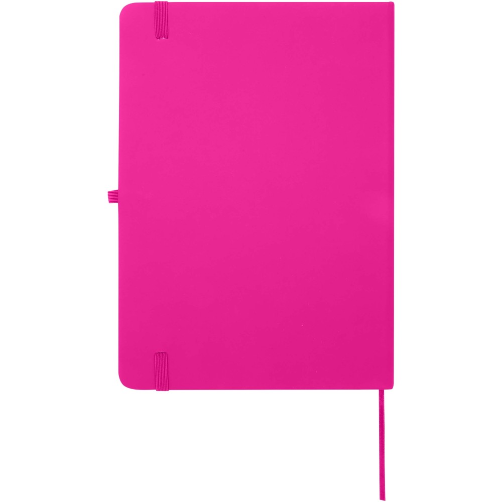 A Spectrum Plus A5 keményfedeles jegyzetfüzet lekerekített sarkokkal nemcsak az irodai mindennapok elengedhetetlen kelléke, hanem remek lehetőség márkád népszerűsítésére is. A jegyzetfüzet puha tapintású borítóval rendelkezik és 80 vonalas, krémszínű, 70 g/m2-es lapból áll, amely tökéletes gyors ötletek vagy hosszabb jegyzetek rögzítésére. A jegyzetfüzet tolltartó hurokkal, gumiszalagos záródással, könyvjelzővel és harmonikazsebbel van ellátva. Emblémázás: Tamponnyomás, UV nyomtatás