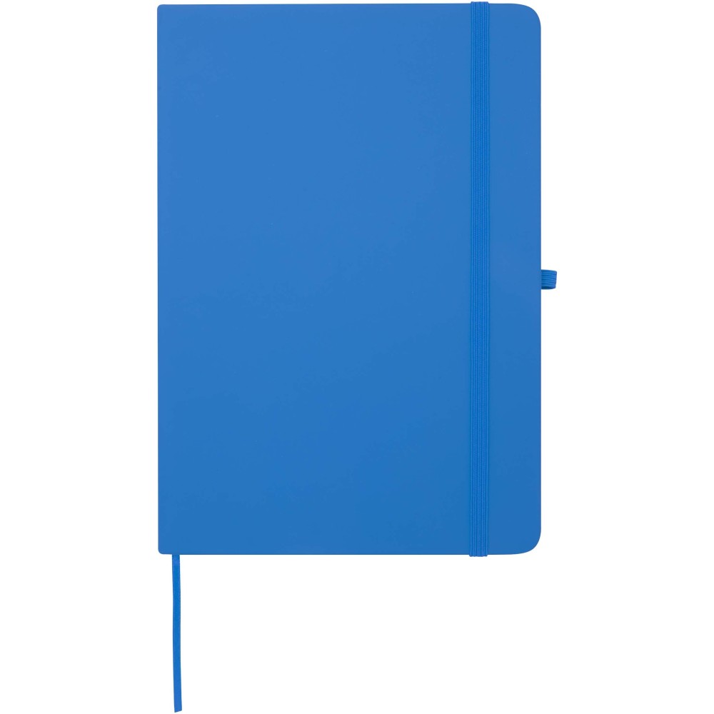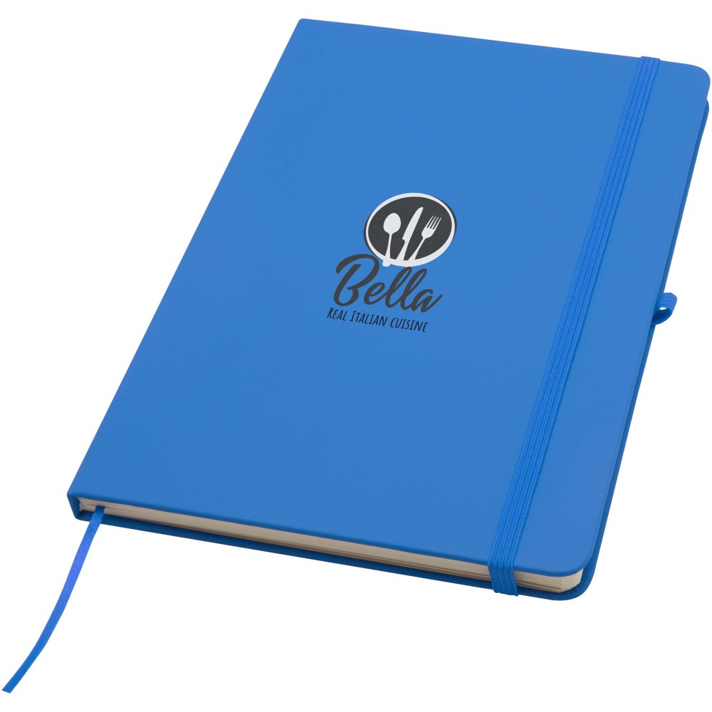 A Spectrum Plus A5 keményfedeles jegyzetfüzet lekerekített sarkokkal nemcsak az irodai mindennapok elengedhetetlen kelléke, hanem remek lehetőség márkád népszerűsítésére is. A jegyzetfüzet puha tapintású borítóval rendelkezik és 80 vonalas, krémszínű, 70 g/m2-es lapból áll, amely tökéletes gyors ötletek vagy hosszabb jegyzetek rögzítésére. A jegyzetfüzet tolltartó hurokkal, gumiszalagos záródással, könyvjelzővel és harmonikazsebbel van ellátva. Emblémázás: Tamponnyomás, UV nyomtatás
