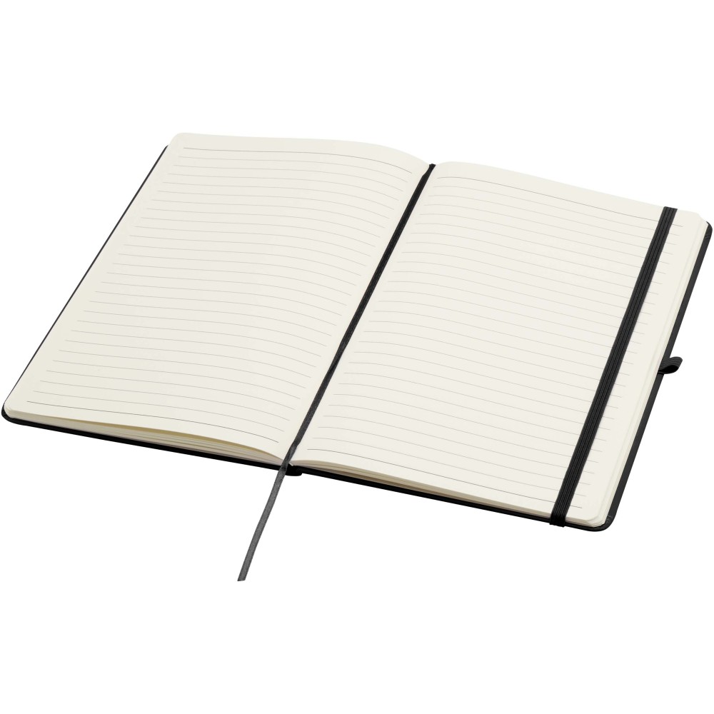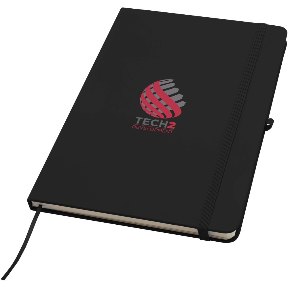 A Spectrum Plus A5 keményfedeles jegyzetfüzet lekerekített sarkokkal nemcsak az irodai mindennapok elengedhetetlen kelléke, hanem remek lehetőség márkád népszerűsítésére is. A jegyzetfüzet puha tapintású borítóval rendelkezik és 80 vonalas, krémszínű, 70 g/m2-es lapból áll, amely tökéletes gyors ötletek vagy hosszabb jegyzetek rögzítésére. A jegyzetfüzet tolltartó hurokkal, gumiszalagos záródással, könyvjelzővel és harmonikazsebbel van ellátva. Emblémázás: Tamponnyomás, UV nyomtatás