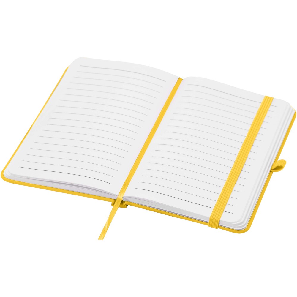 A Spectrum Plus A6 keményfedeles jegyzetfüzet lekerekített sarkokkal nemcsak az irodai mindennapok elengedhetetlen kelléke, hanem remek lehetőség márkád népszerűsítésére is. A jegyzetfüzet puha tapintású borítóval rendelkezik és 80 vonalas, krémszínű, 70 g/m2-es lapból áll, amely tökéletes gyors ötletek vagy hosszabb jegyzetek rögzítésére. A jegyzetfüzet tolltartó hurokkal, gumiszalagos záródással, könyvjelzővel és harmonikazsebbel van ellátva. Emblémázás: Tamponnyomás