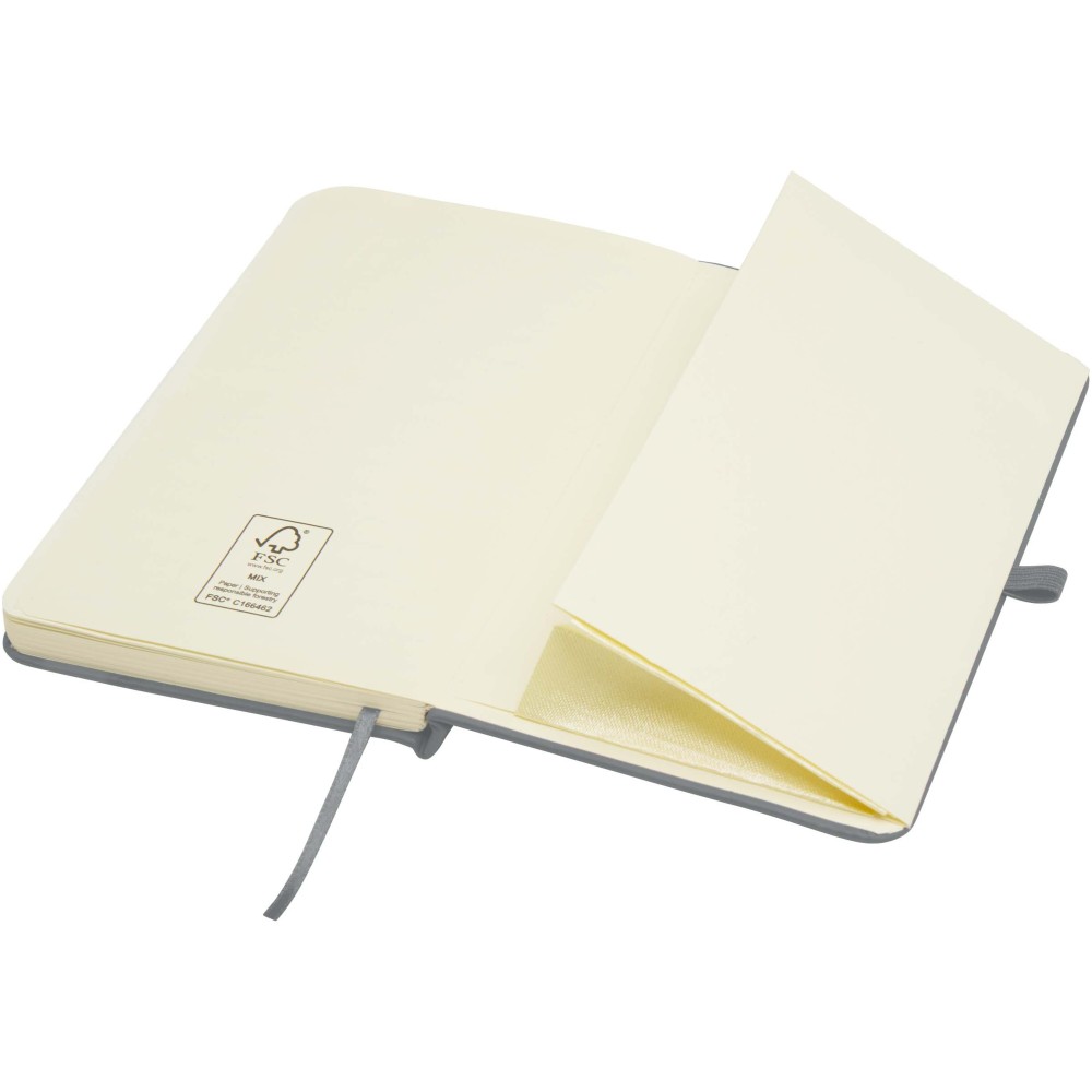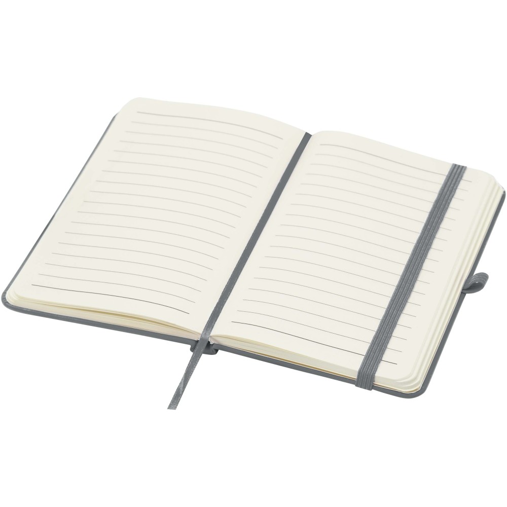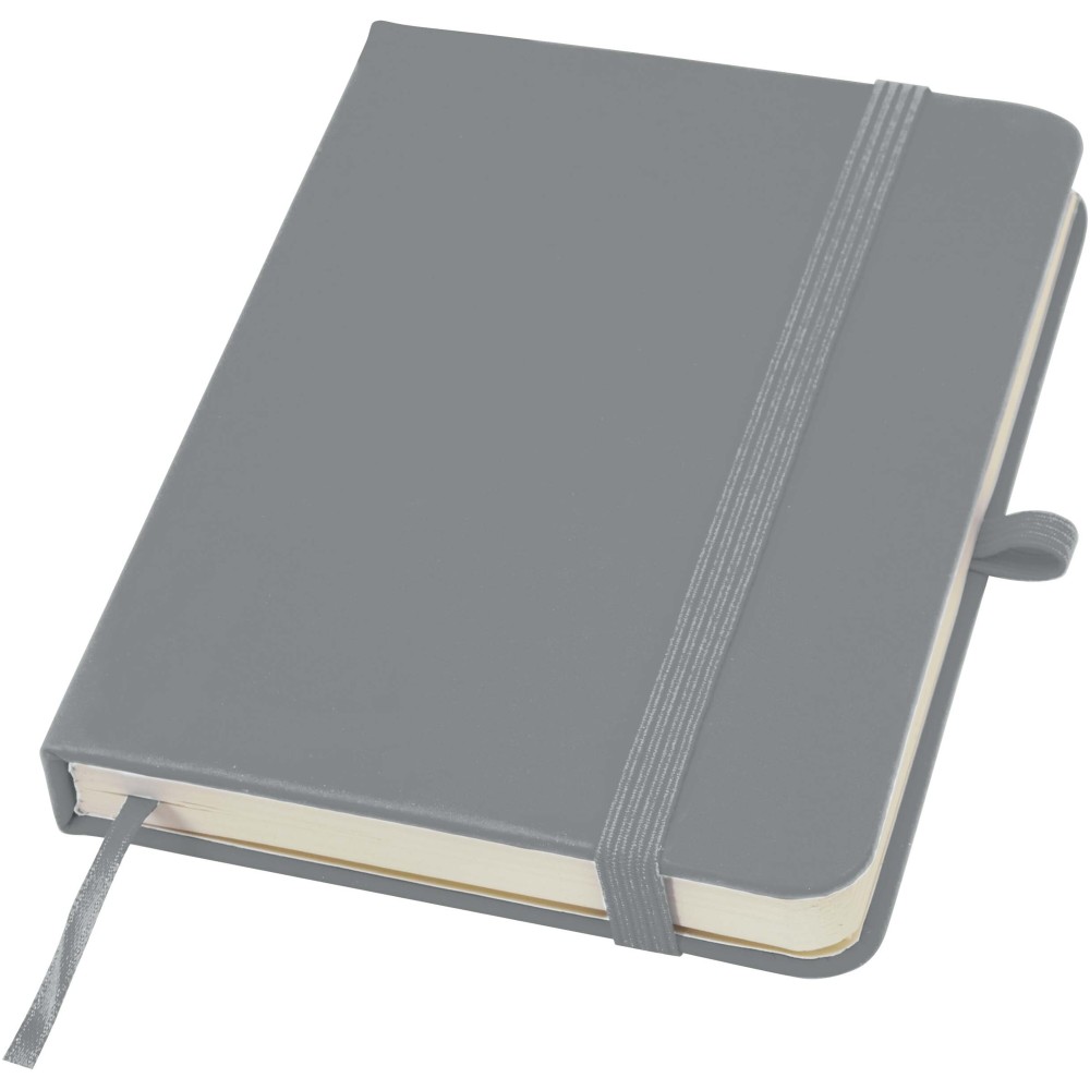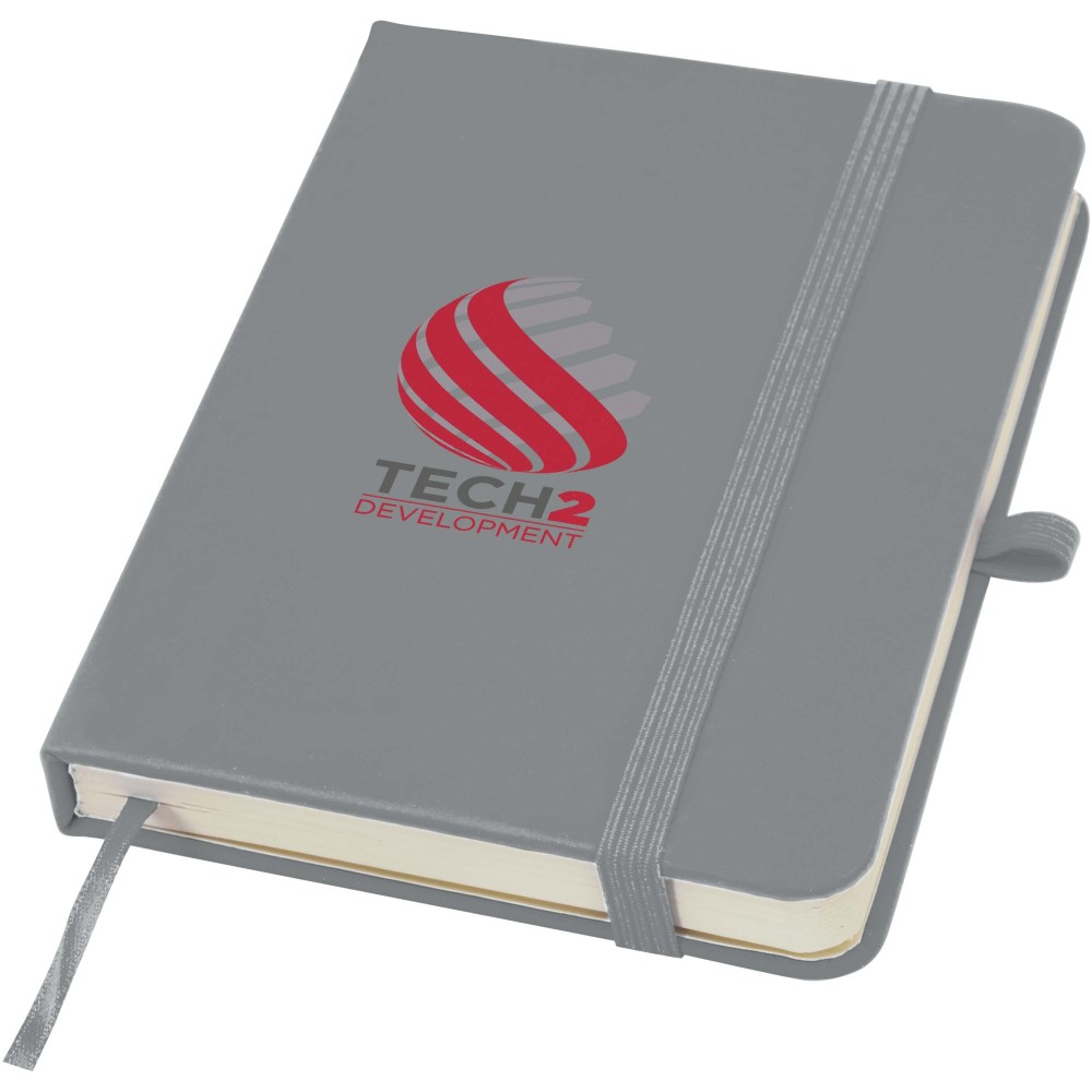 A Spectrum Plus A6 keményfedeles jegyzetfüzet lekerekített sarkokkal nemcsak az irodai mindennapok elengedhetetlen kelléke, hanem remek lehetőség márkád népszerűsítésére is. A jegyzetfüzet puha tapintású borítóval rendelkezik és 80 vonalas, krémszínű, 70 g/m2-es lapból áll, amely tökéletes gyors ötletek vagy hosszabb jegyzetek rögzítésére. A jegyzetfüzet tolltartó hurokkal, gumiszalagos záródással, könyvjelzővel és harmonikazsebbel van ellátva. Emblémázás: Tamponnyomás