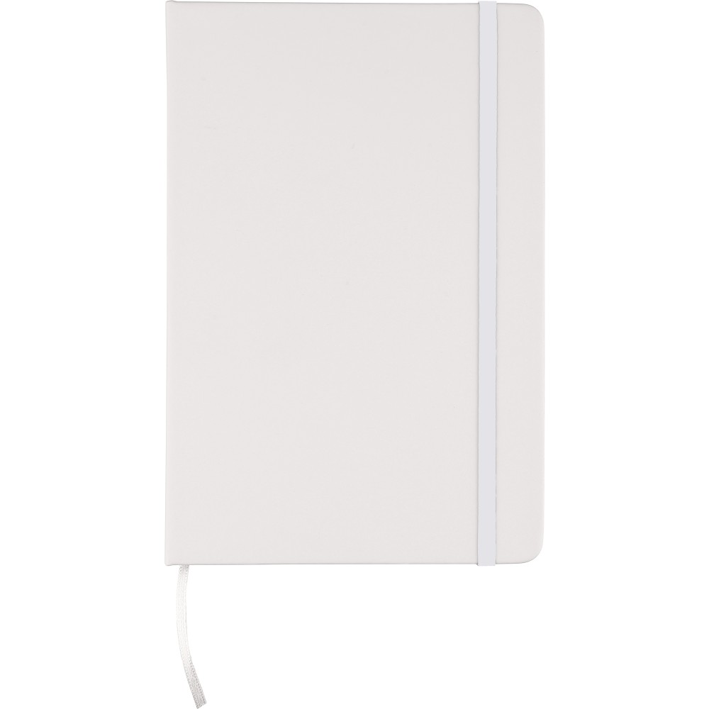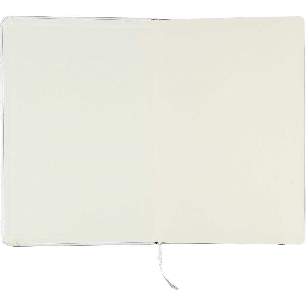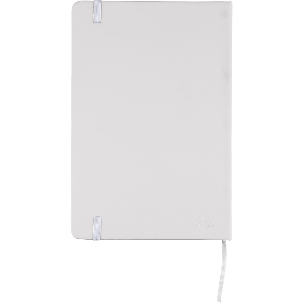 A5-ös méretű jegyzetfüzet rPET PU anyagból készült kemény borítóval, 80 vonalas lappal (70g/m2), színben illeszkedő gumipánttal és könyvjelző szalaggal. Az újrahasznosított anyagra utaló dombornyomott logóval a füzet hátoldalán. Emblémázás: Szitanyomás, Tamponnyomás, UV nyomtatás