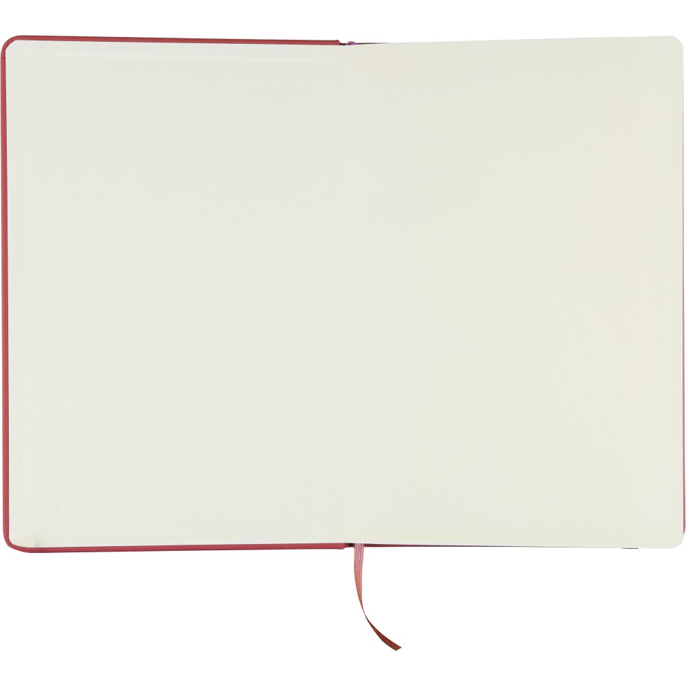A5-ös méretű jegyzetfüzet rPET PU anyagból készült kemény borítóval, 80 vonalas lappal (70g/m2), színben illeszkedő gumipánttal és könyvjelző szalaggal. Az újrahasznosított anyagra utaló dombornyomott logóval a füzet hátoldalán. Emblémázás: Szitanyomás, Tamponnyomás, UV nyomtatás