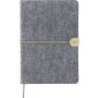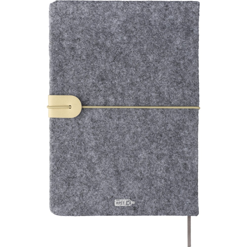 Újrahasznosított filcből készült jegyzetfüzet, kb. A5-ös méretű, 80 lapos. Puha tapintású kemény borítóval, gumiszalaggal és kívül PU zárópánttal. Szalagos könyvjelzővel és 70 g/m2-es vonalas papírral. A hátoldalán lézergravírozott újrahasznosított logóval. Emblémázás: Szitanyomás